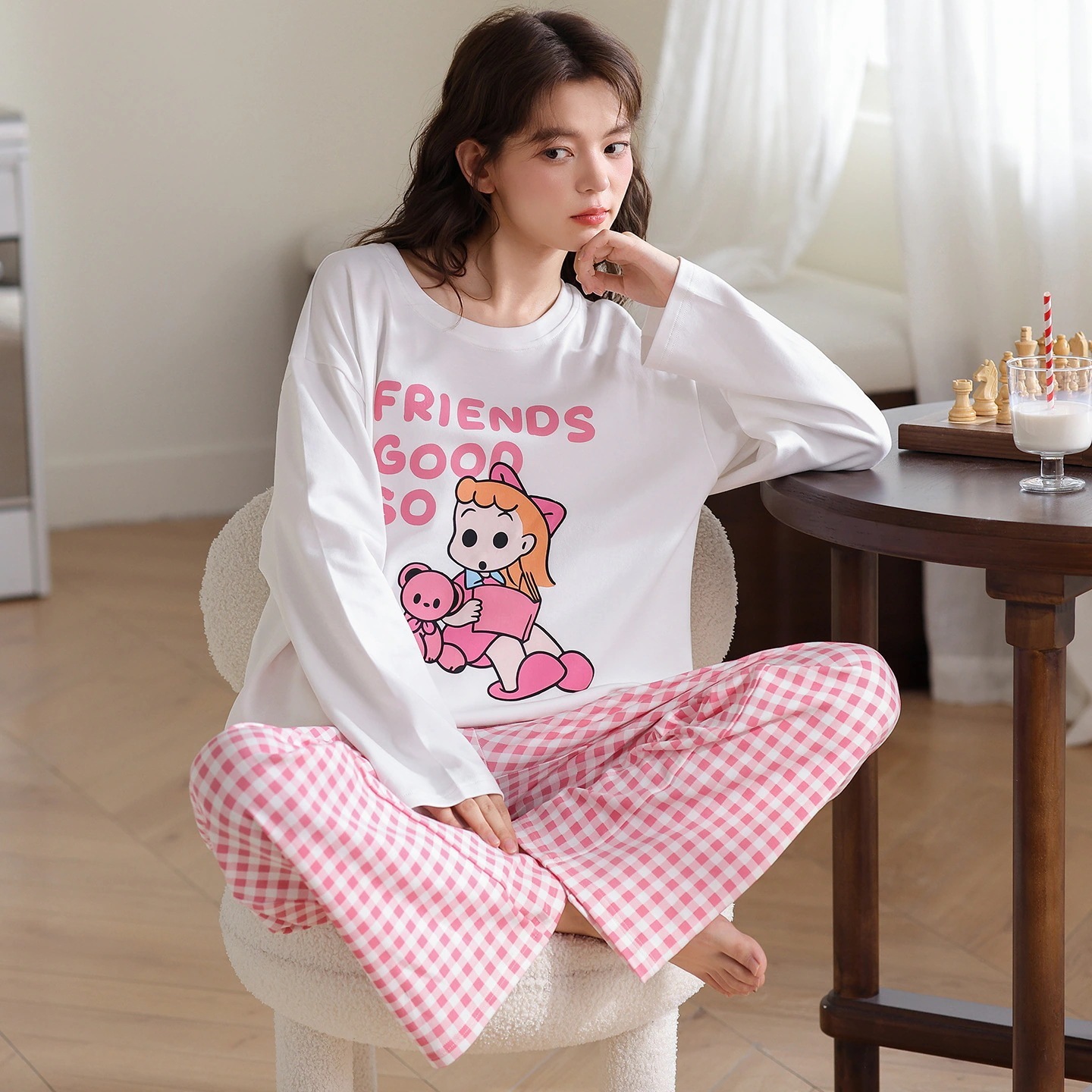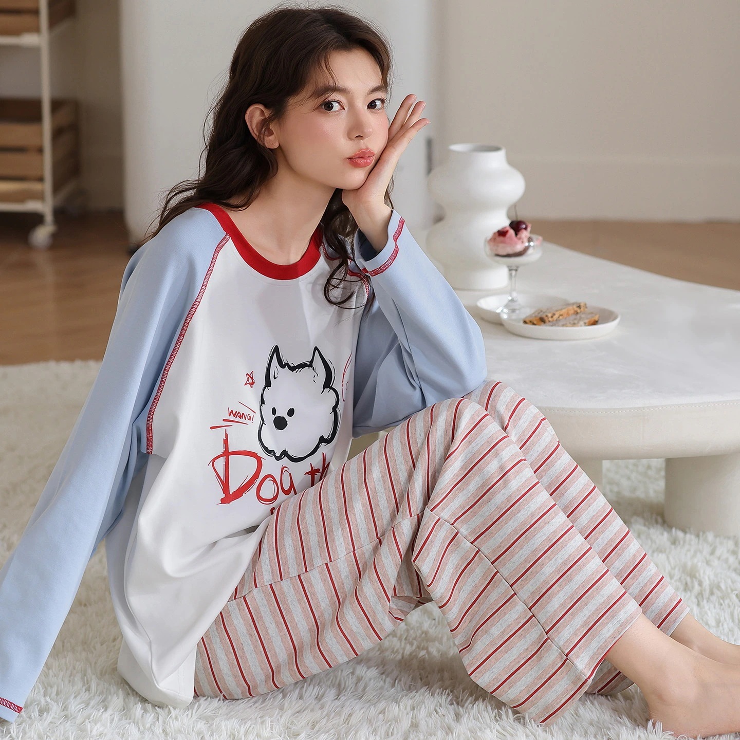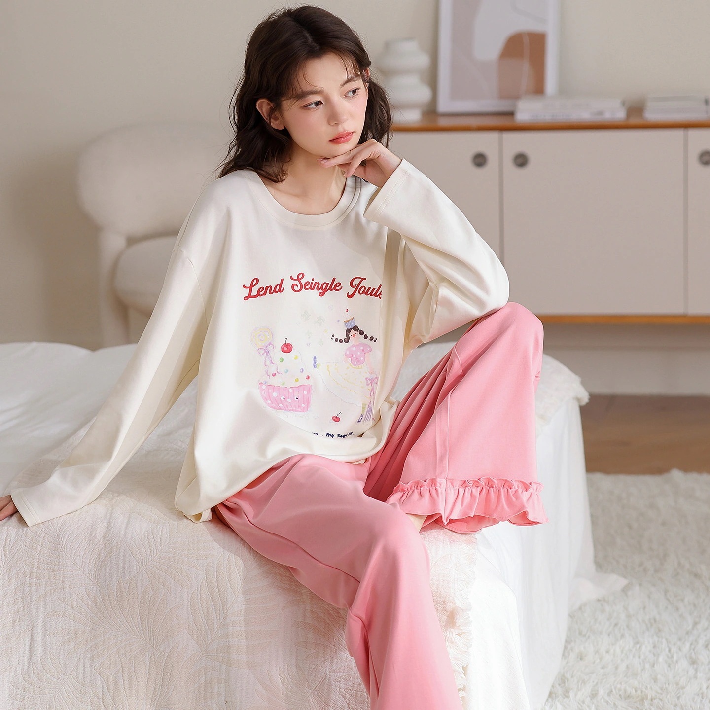 韓国風 冬・秋用 長袖パジャマ 女性用 キュート キャラクター 女性用 丸首 ルームウェア 2点セット 外着可能