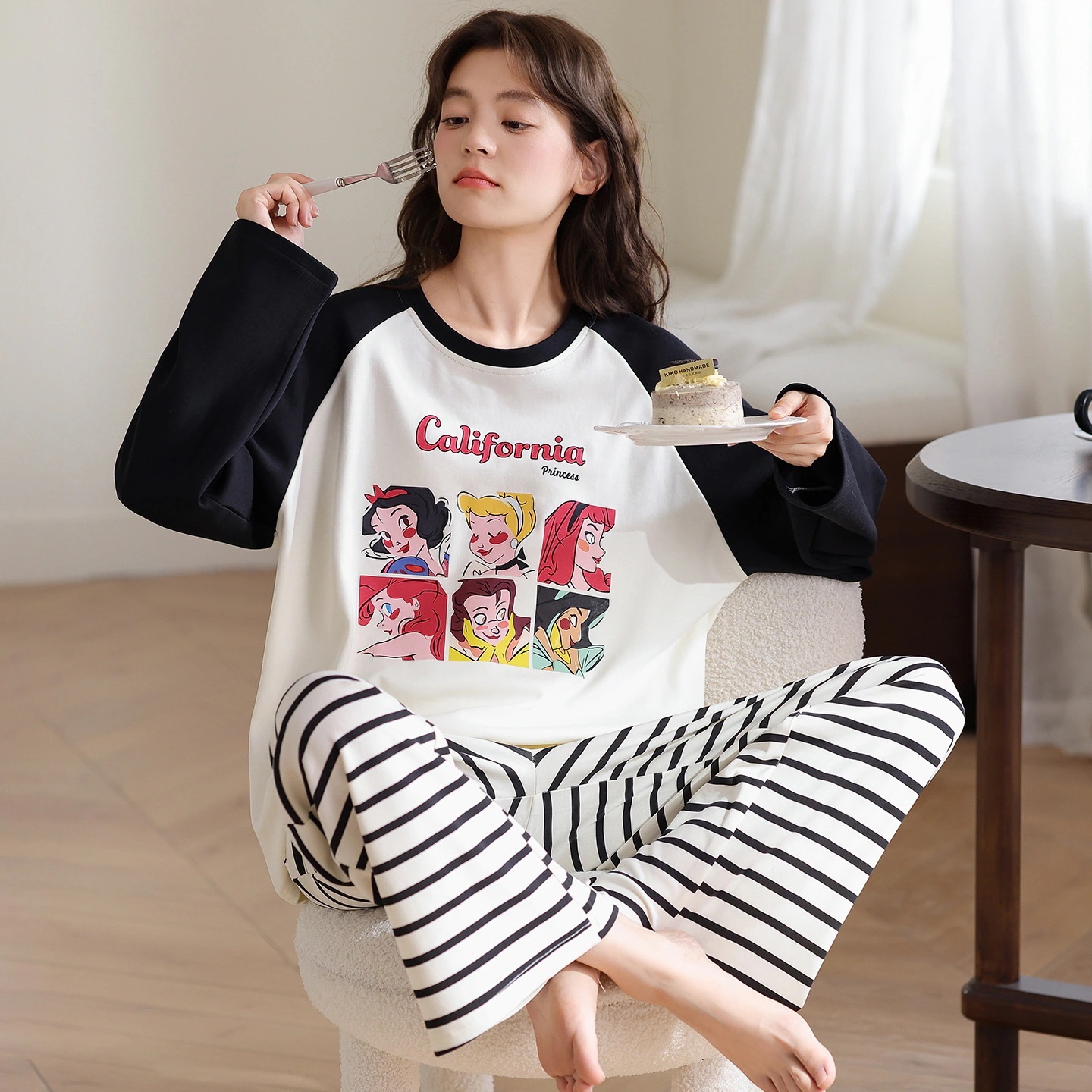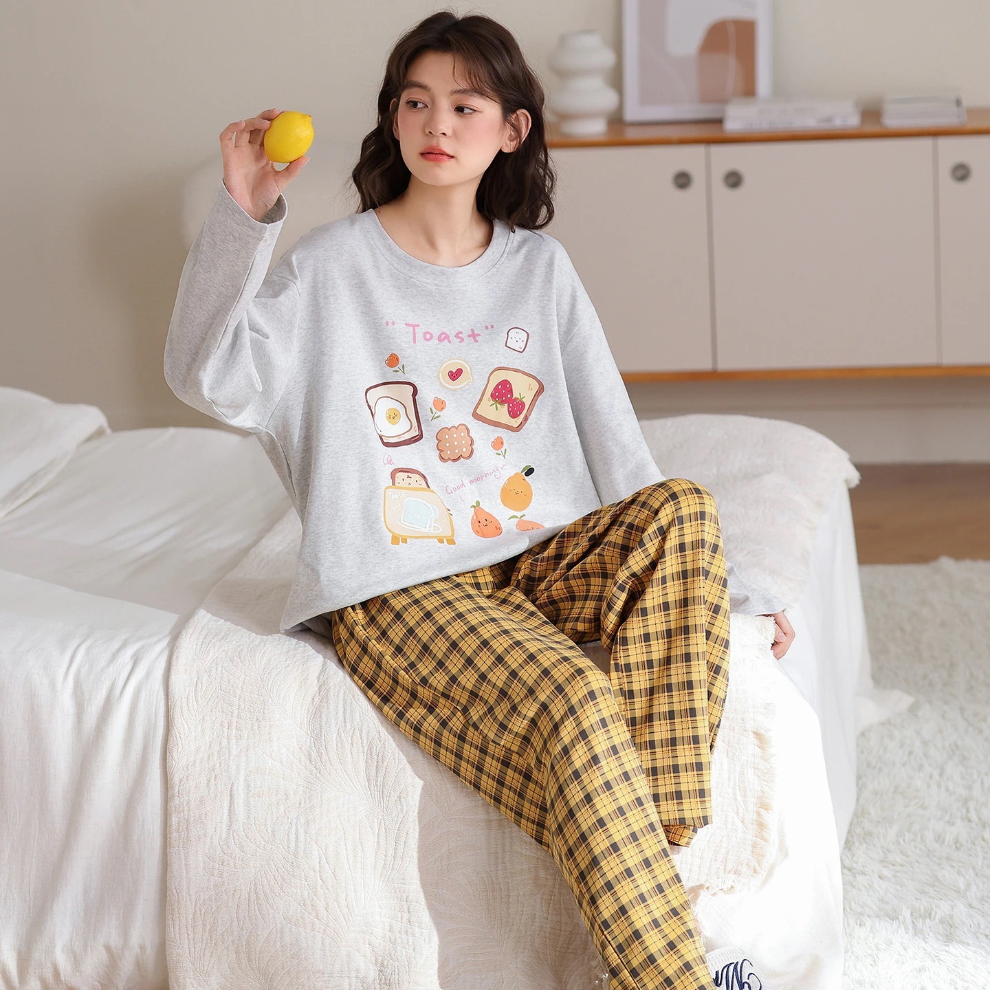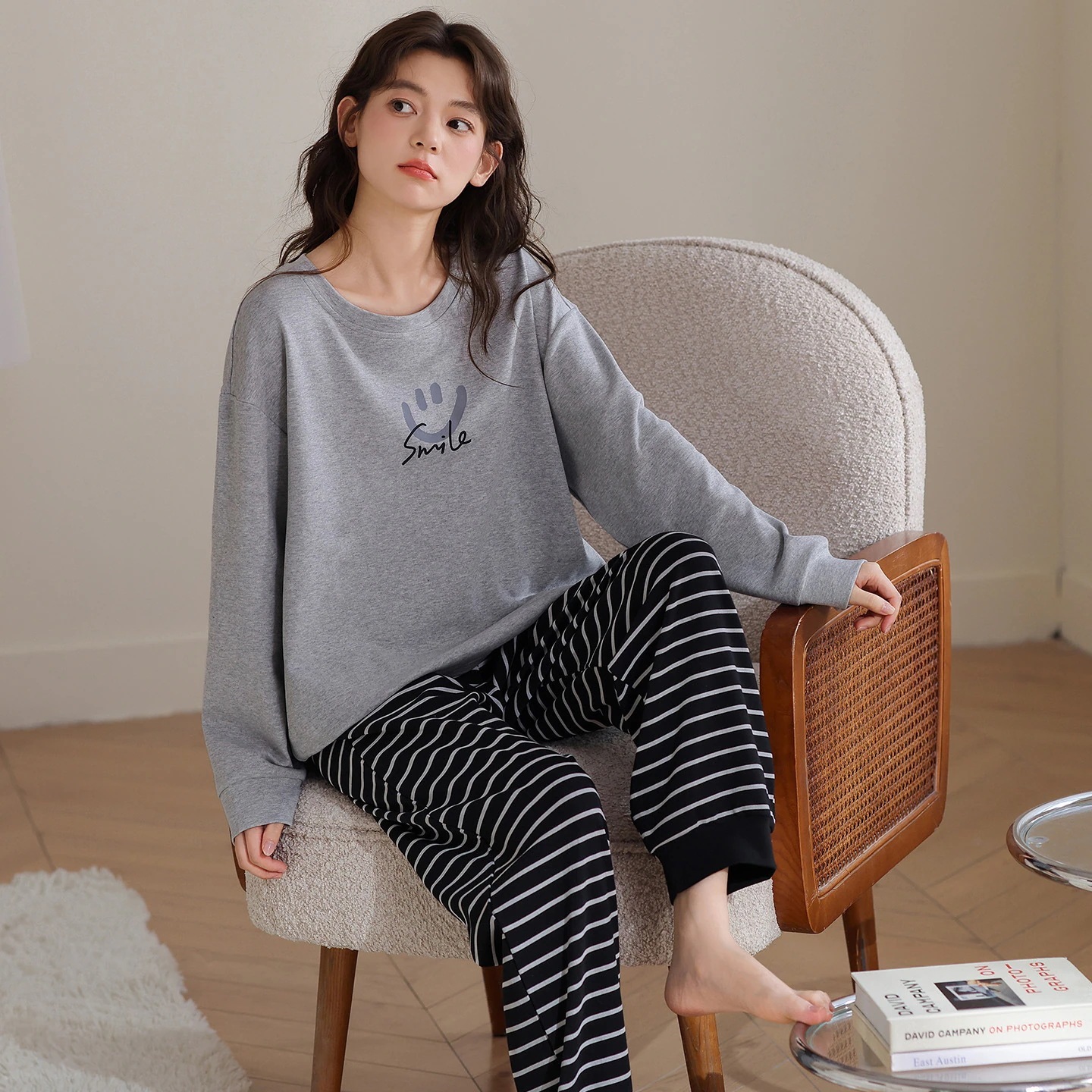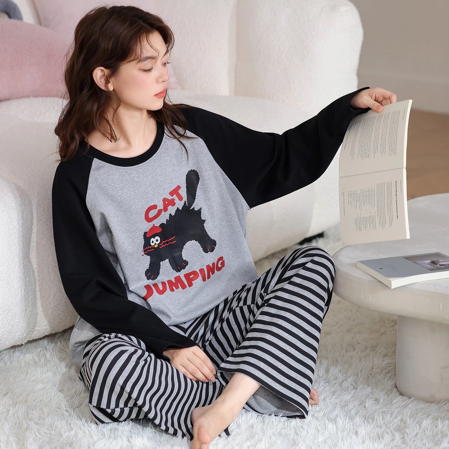 韓国風 冬・秋用 長袖パジャマ 女性用 キュート キャラクター 女性用 丸首 ルームウェア 2点セット 外着可能