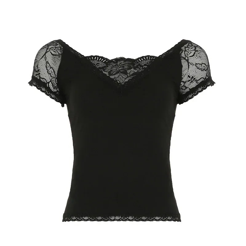 【レースパネル】Vネック シンプルカラー 半袖 タイトフィット トップス
