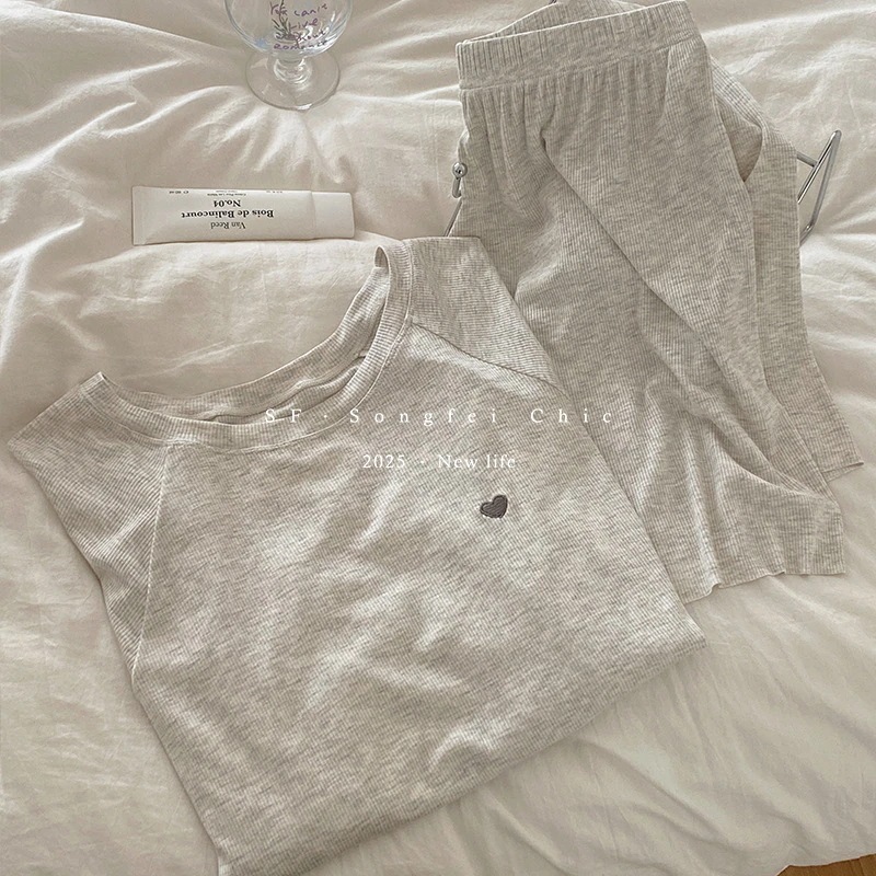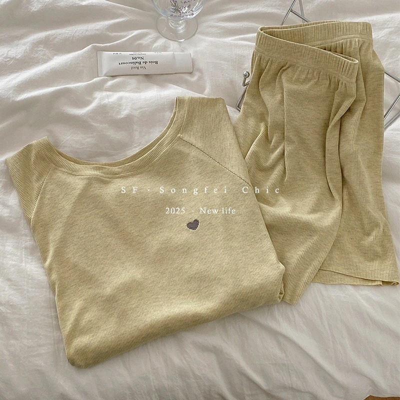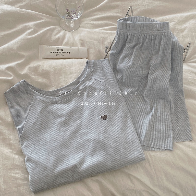 夏パジャマ レディースハート刺繍半袖半ズボンパジャマストレッチスーツ夏の新型ヘッダー親肌部屋着2点セット ルームウェア