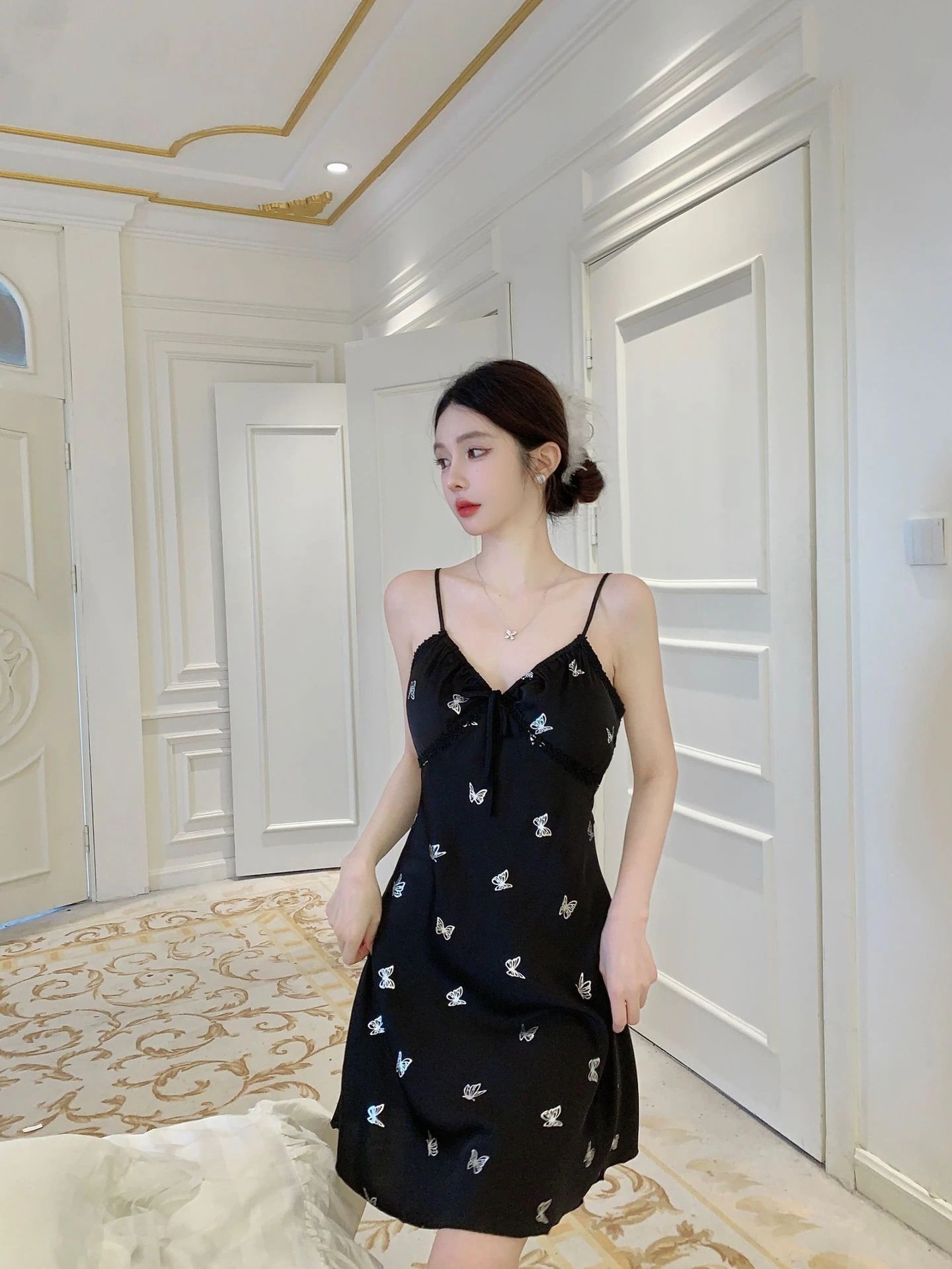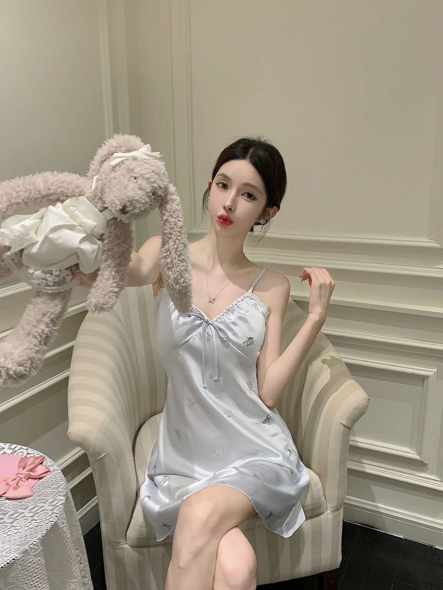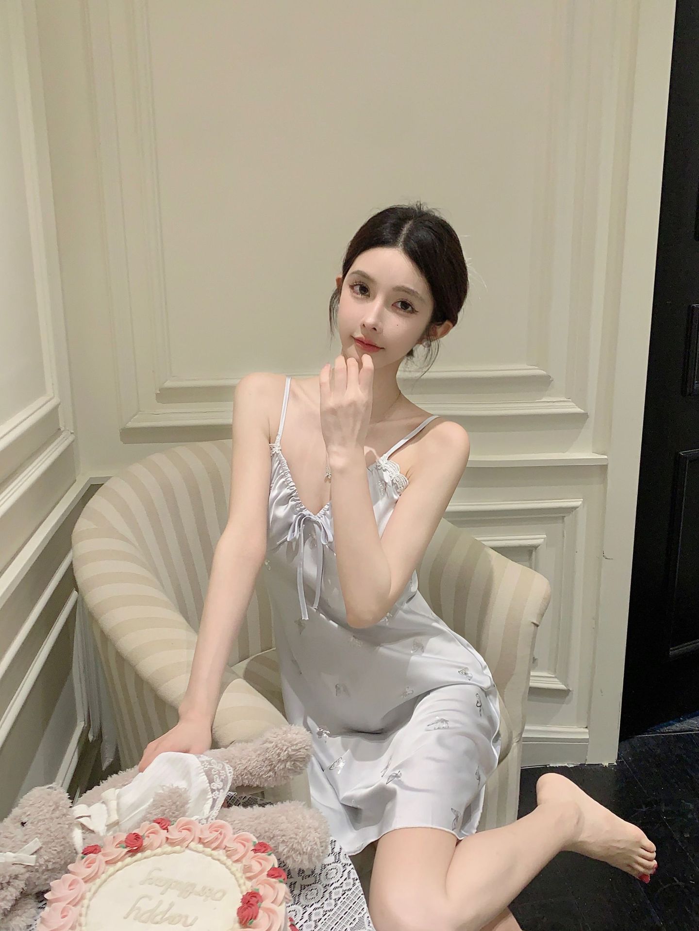 夏パジャマ レディースセクシースリーパーレディース夏キャミソール氷シルクパジャマinsプリント純欲パジャマ胸当て付き ルームウェア