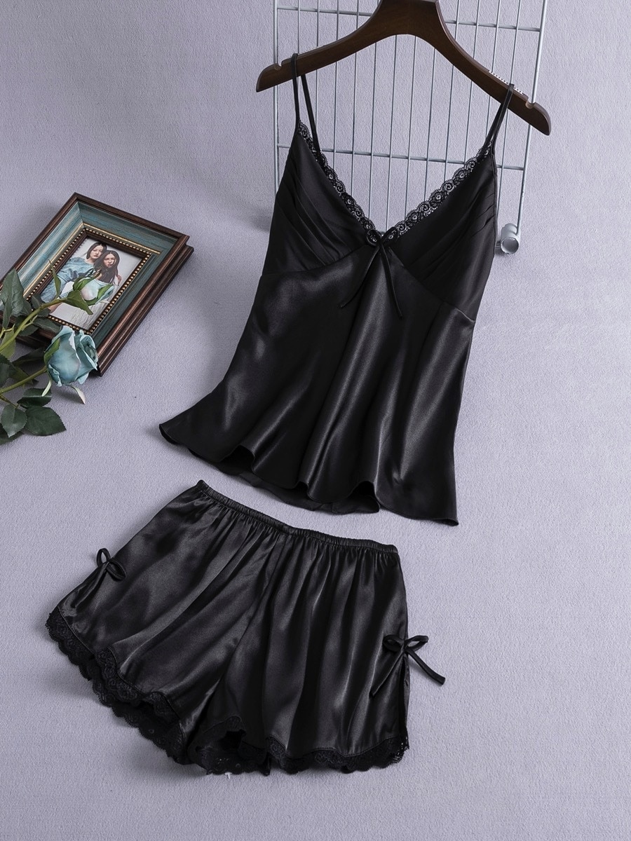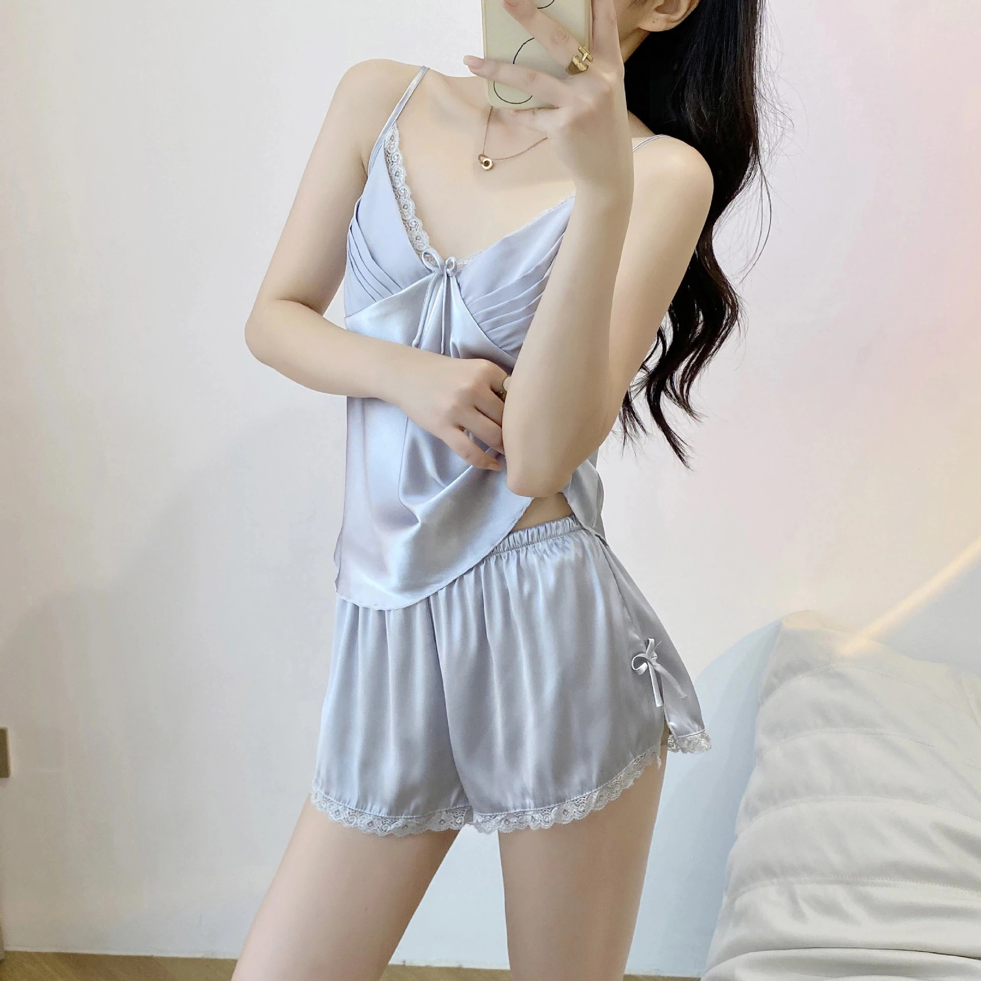 夏パジャマ レディースキャミソールパジャマ女性の夏のセクシーなアイスシルク2枚セットシルクショートパンツ大判薄部屋着 ルームウェア