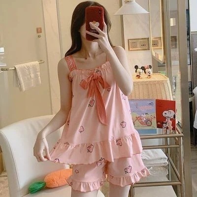 夏パジャマ レディース薄い韓国版キャミソールパジャマ女性2枚セットカジュアル漫画学生少女リボン部屋着 ルームウェア