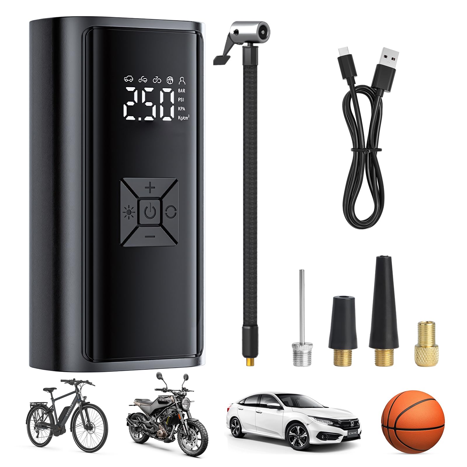自転車 空気入れ 車 電動 ボール【10秒充填 自動停止】充電式 コードレス バイク 電動 空気圧指定可 最大圧力150PSI 多機能 6000mAh Type-c出力ポート急速充電 自動車/自転車/