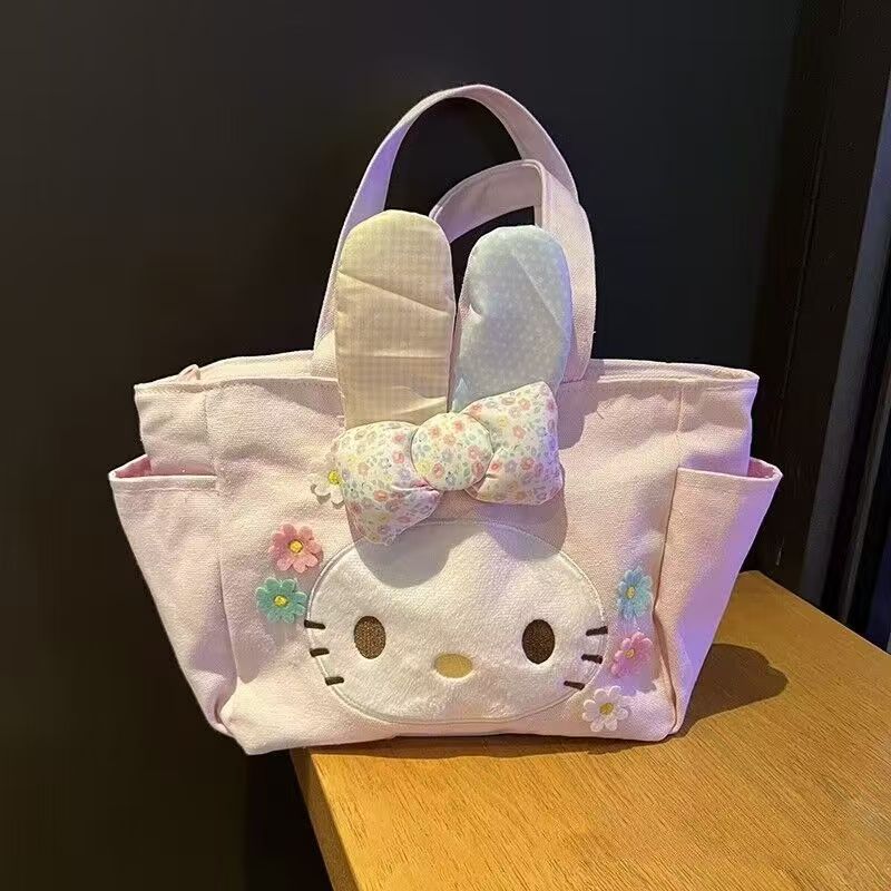 可愛い変身ウサギの耳と花のメロディのキャンバス弁当袋 ランチバッグ 持ち手付きバッグ 学生用弁当持ち手袋