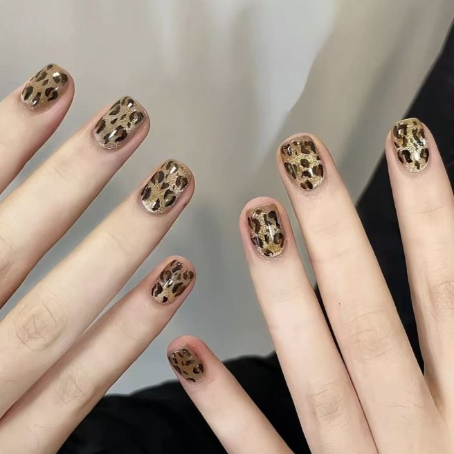 秋冬のヒョウ柄ネイル着甲短め甲片ぼかし琥珀ブラウンで白キャッツアイネイル