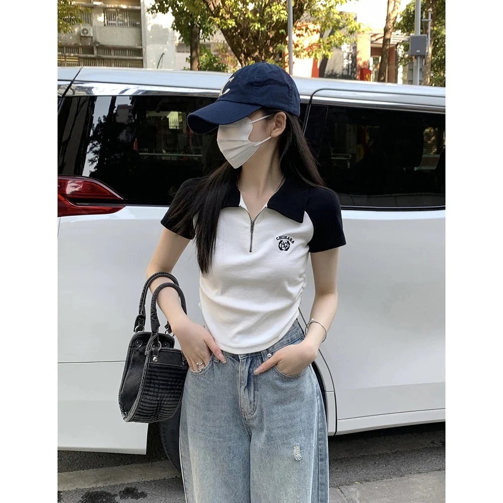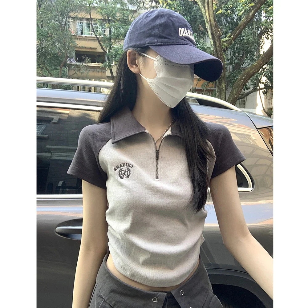 2025春夏 Tシャツ レディース 半袖 韓国風 プリント ショート丈 トップス スポーツミックスストリートバイカラーおしゃれ系ラウンドネックスリーブカジュアル大人可愛いスポーティー配色ハーフT