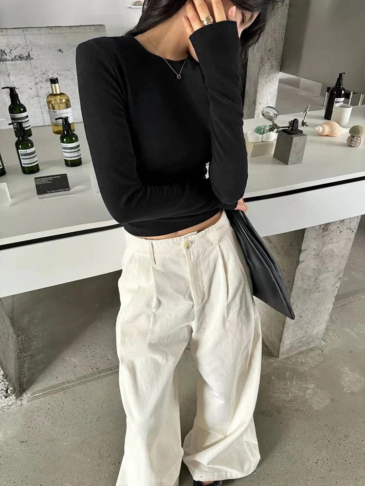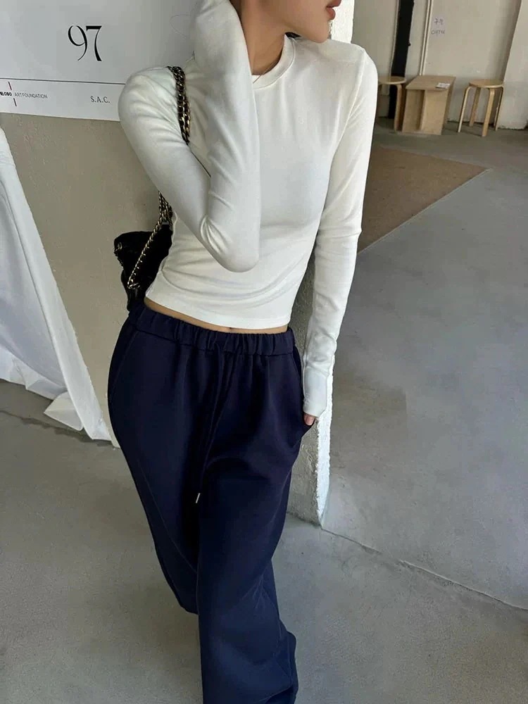 2025春夏 長袖 Tシャツ ショート丈 カットソーラウンドネックK-POPトップスカジュアル配色韓国系ストリートへそ出しタイトVネックスリーブ 肌見せ T ファッションレディースかわいいサイド衣装風