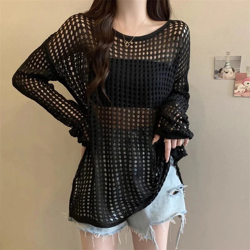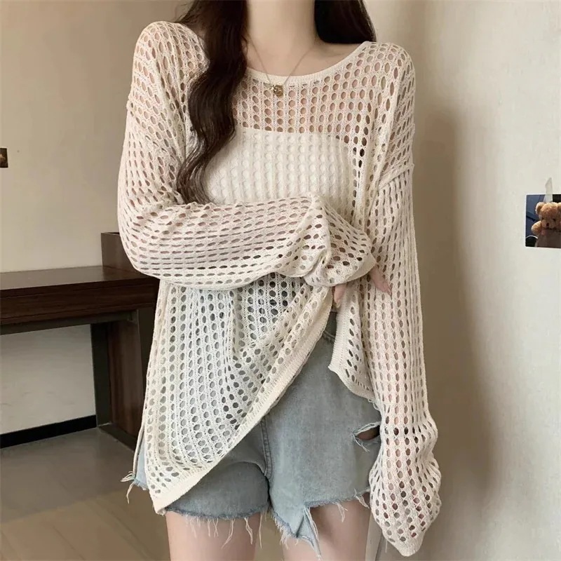 2025春夏トップス 長袖 透けニット レディースショート丈おしゃれ 韓国肌見せカラーセーターリブ色っぽ 女っぽ カジュアル きれいめ 大人ファッション加工フェミニンフレンチ秋冬春系