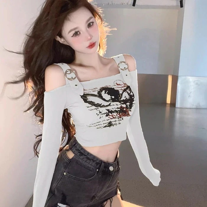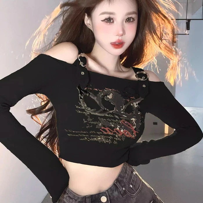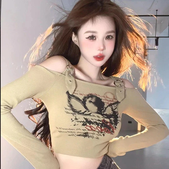 2025春夏ロンT ベルトデザイン オフショルダー クロップド丈 ショート丈 スリムフィット トップス へそ出し 肩出し 長袖 レトロ
