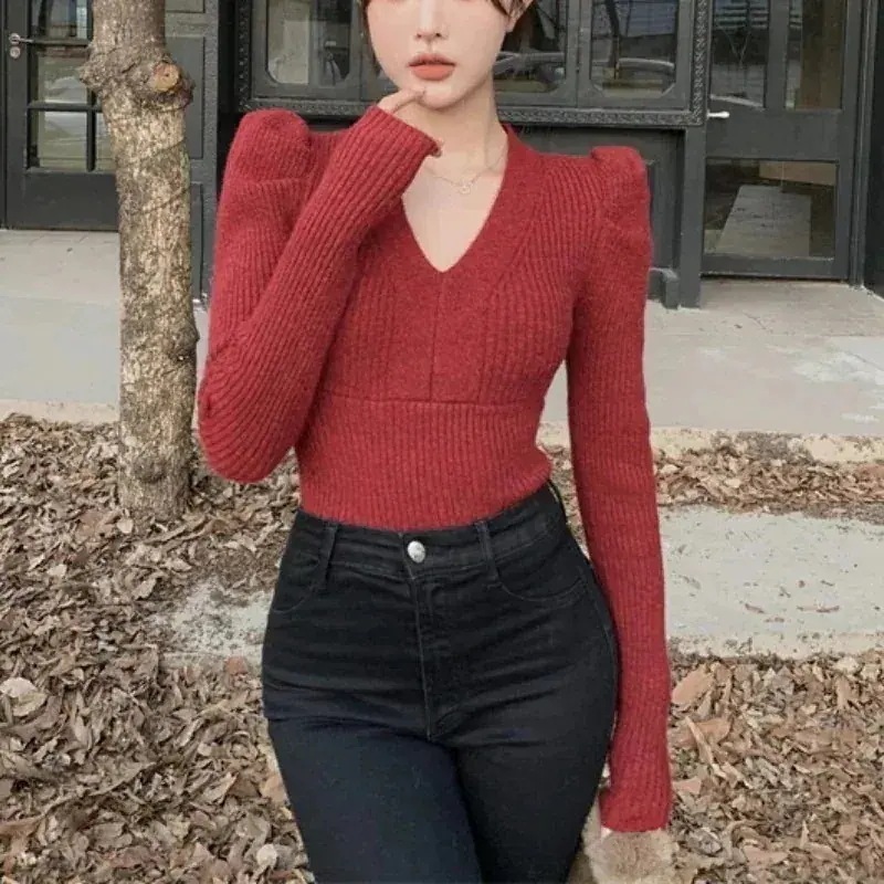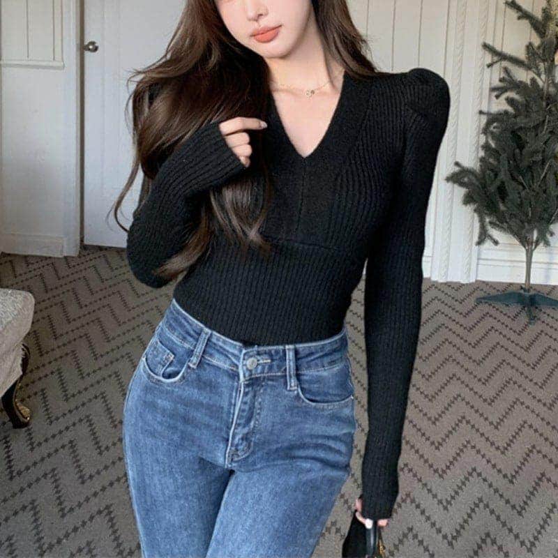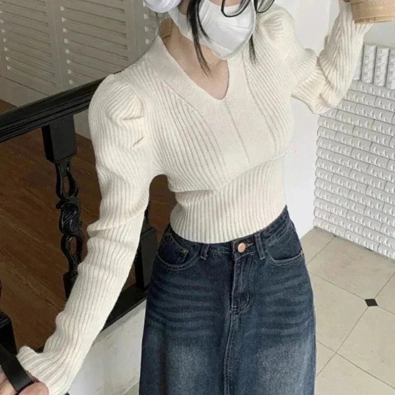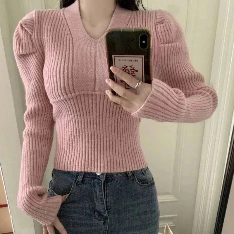 カシミヤタッチ ベーシックニット 韓国版秋冬新作優しくて甘いVネックスリムスリムスリムスリムでモチモチした純欲風ニットバブル袖セーター女