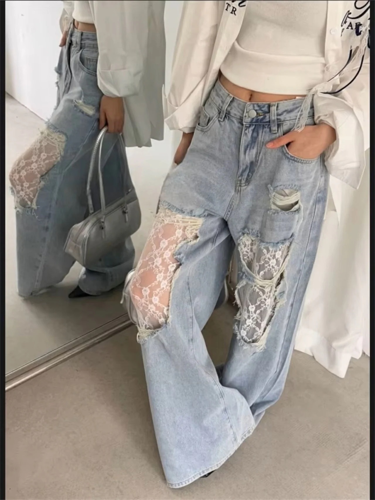 2025春夏 デニムパンツ ボトムス ハイウエスト ジーンズ K-POP ストリートファッション系モップ韓国風ファッション練習ジーンズ シルエット加工ゆったりレッグレディースカジュアルジーパン衣装