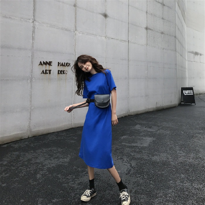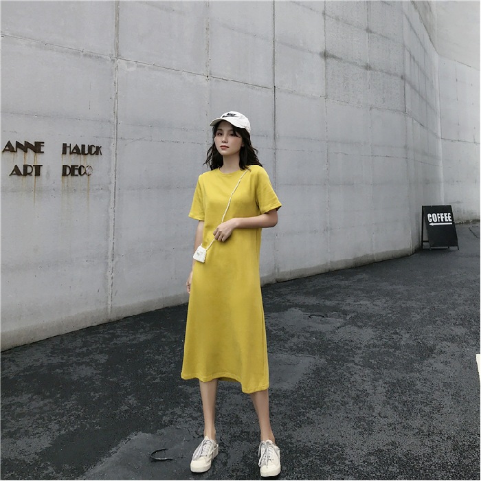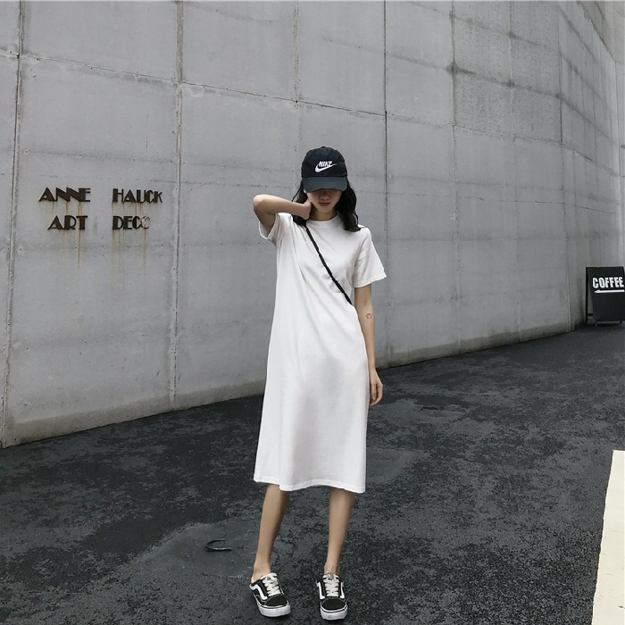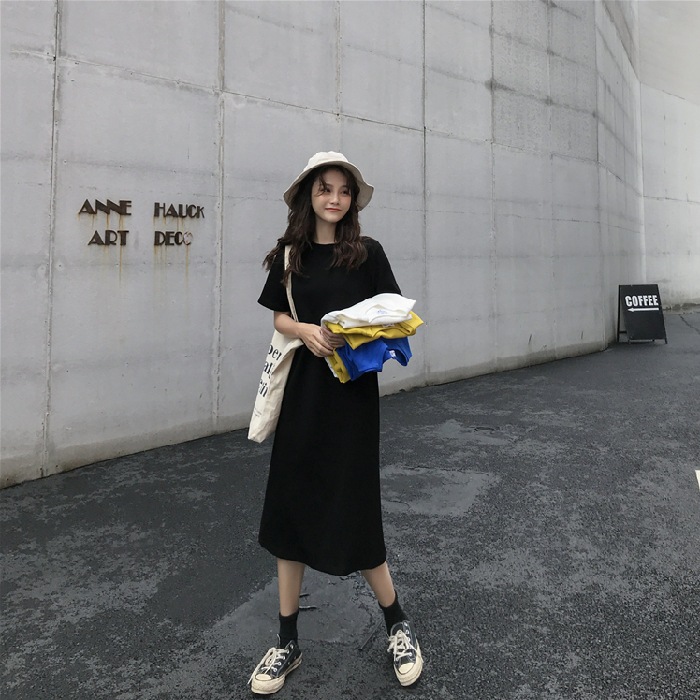 長いtシャツのスカートの夏の韓国版の婦人服の娘の蜜はやせてゆったりしているファッションの中で長い半袖のまっすぐな筒のワンピースの潮を現します