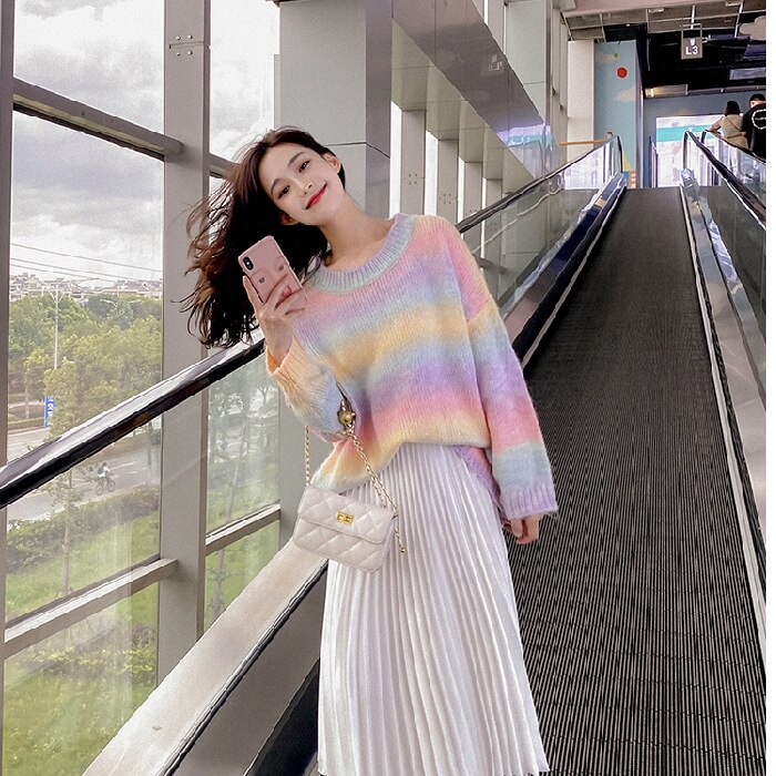 【 迅速な出荷 】ベーシックニット ラウンドネックニット ラブリータートルネック  ベーシックニット レインボーストライプ セーター かわいい ニット トップス