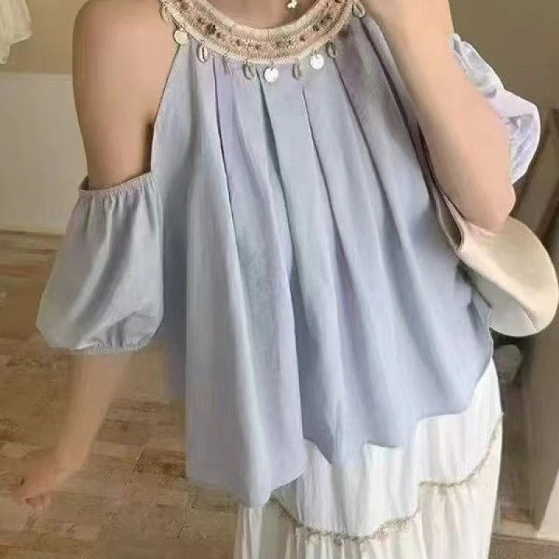 【ブルーシャツ】2025新作 ビーズ 丸首 オフショルダー ゆったりトップス