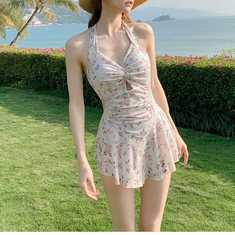 水着 レディース ワンピース 花柄スイムウェア ビーチウェア 女性用水着 フレア水着 着痩せ 温泉水着 海水浴体型カバー可愛いおしゃれ上品胸パッド付き露出控えめ 肩出しお尻盛れる温泉 海水浴 旅行プー