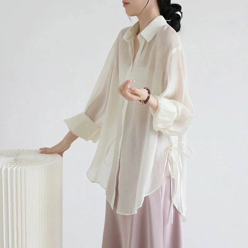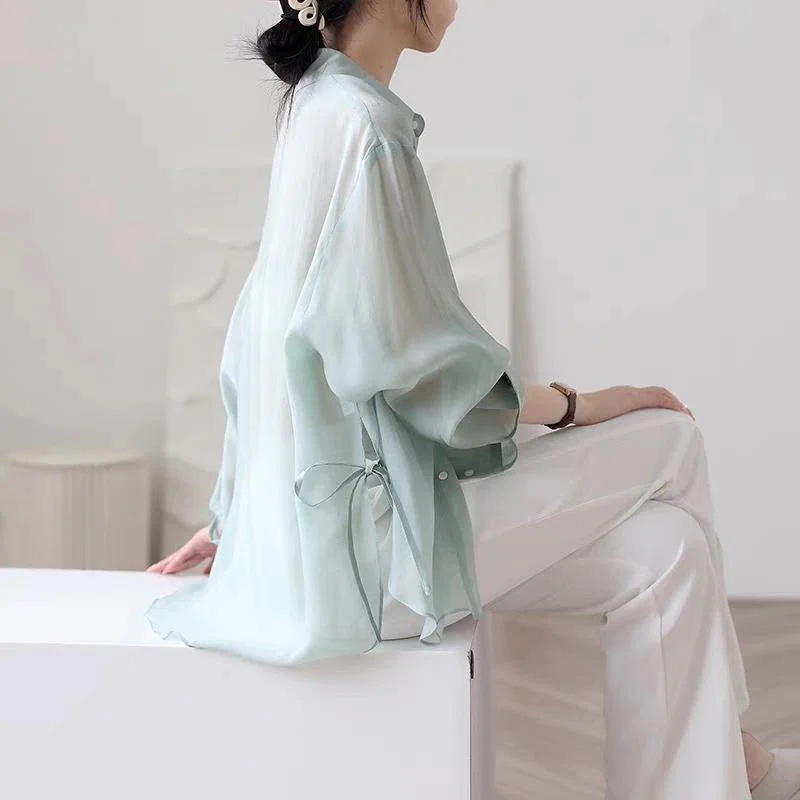 リボンネクタイカーディガン日焼け止め服ジャケットブラウス外シフォンシャツメス夏新しい薄いセクション