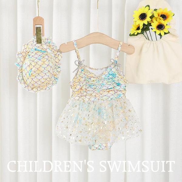キッズ水着女の子ワンピース水着帽子付き子水着スカート水着人魚姫可愛いバックシャンレースイエローブルー90-140cm