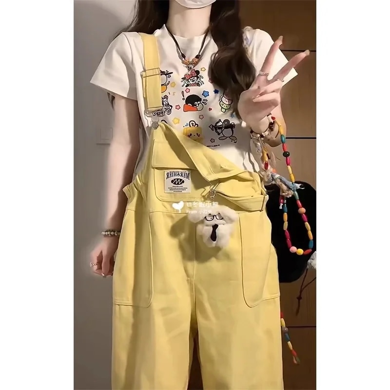 サロペットイエローゆるデニムバックストラップパンツ女性夏新作ストレートワイドロングパンツ