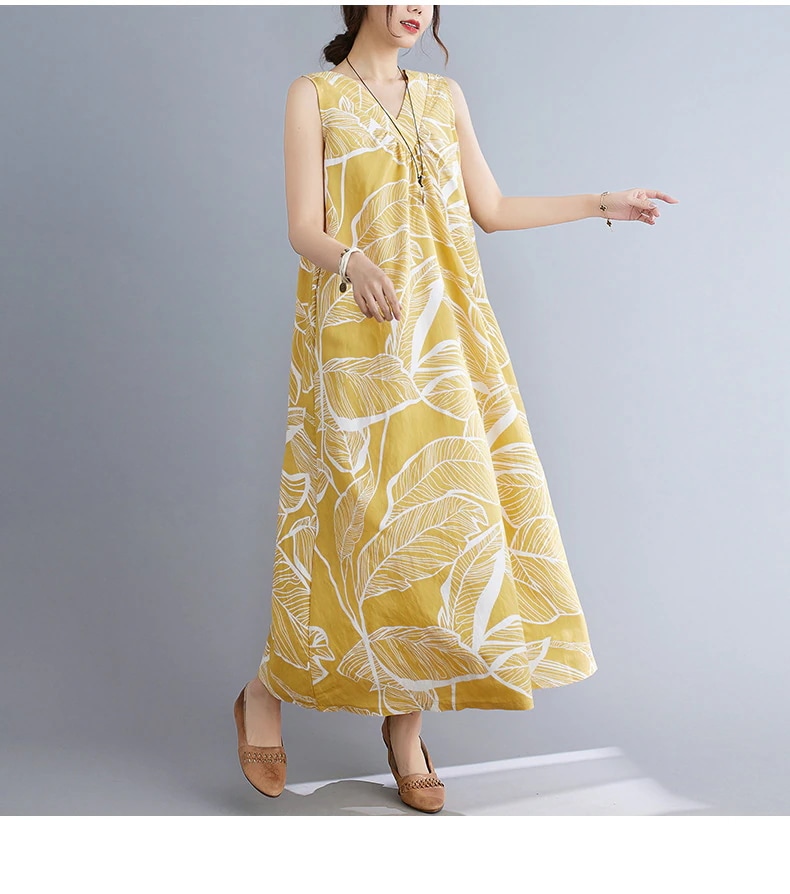 リゾートワンピース きれいめ ワンピース レディース 夏 春 ノースリーブ リーフ柄 Vネック Aライン マキシ丈 リゾート ポケット付き 大きいサイズ ハワイ 白 黄色