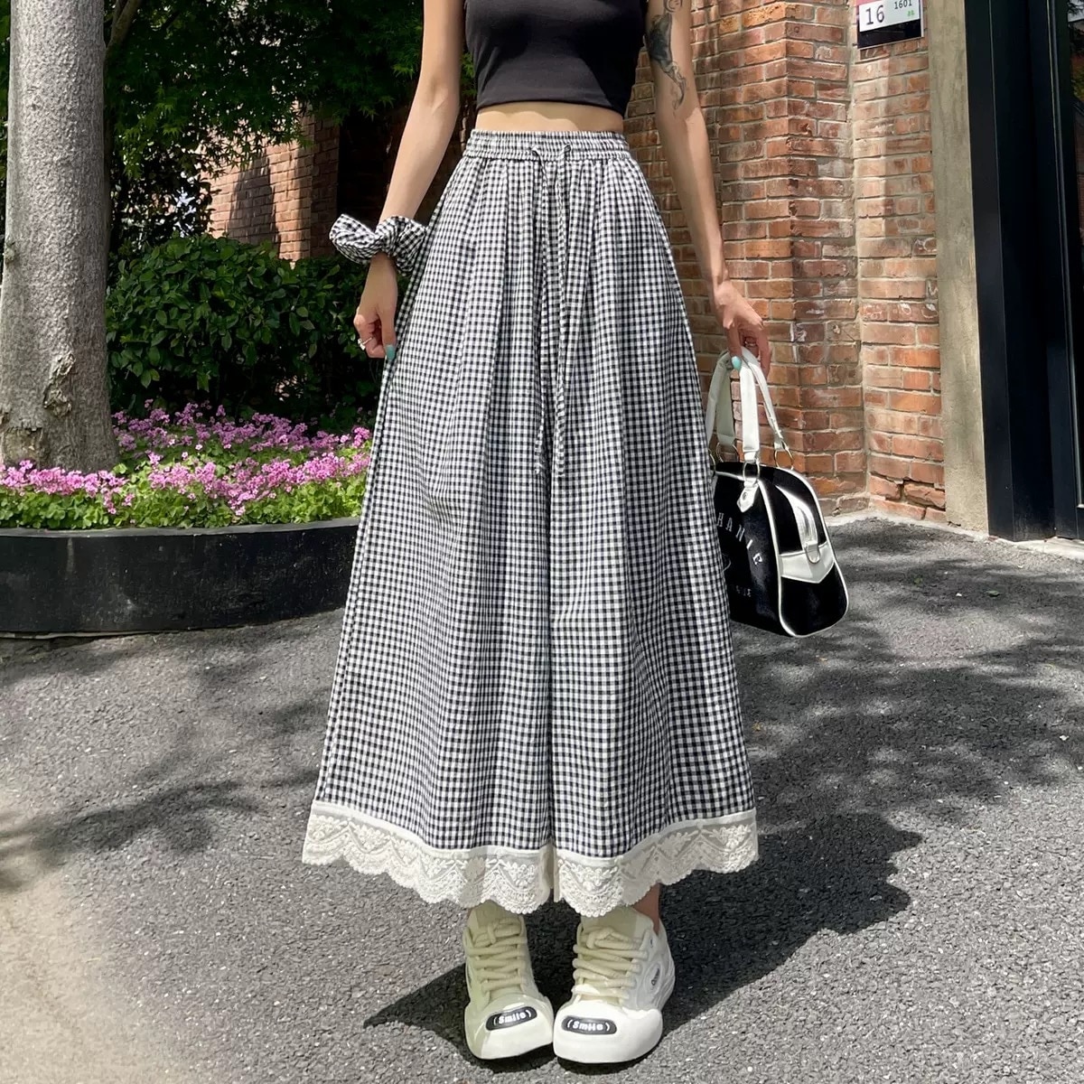 【万能アイテム】 チェックワイドパンツ 快適 ふんわり スカートパンツ 下 裾レース 春夏秋 九分丈 ボトムス レディース 涼しい ゆったり カジュアルワイドパンツ かわいい
