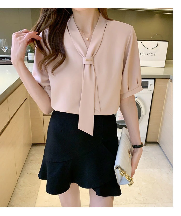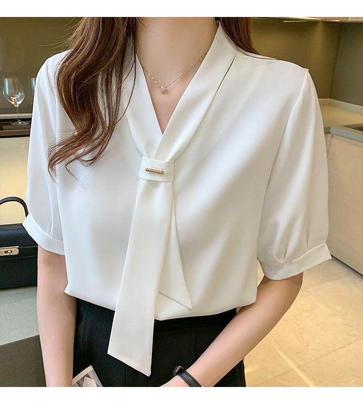 ブラウス レディース 40代 春夏新作 オシャレブラウス 白シフォンシャツ 半袖トップス リボンVネック ブブラウス上品 大人 通勤OL ゆったりシャツ 30代 50代