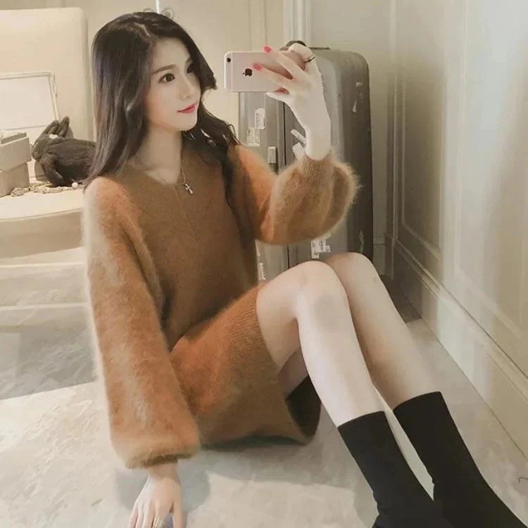 全7色6サイズロングセーターチュニックミニワンピースニットセーターロング丈モヘア調もこもこふわふわVネックゆったり無地
