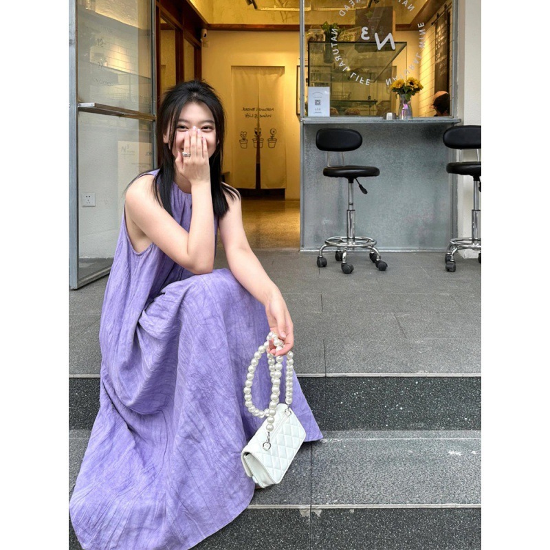 紫色の亜麻のノースリーブのベストのワンピースの女性の夏の新型は首のしわの長いスカートを掛けます