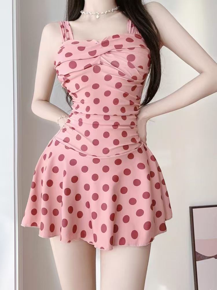 かわいい波点水着女連体控えめ腹隠し肉隠し痩せ温泉超仙セクシー少女小胸洋気