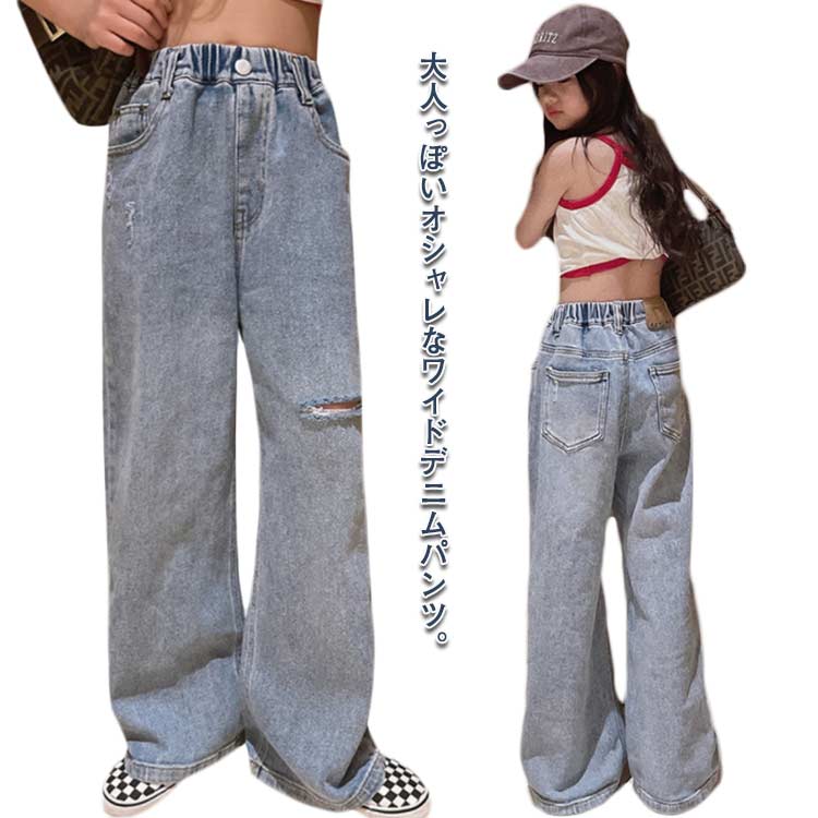 170 こども ワイドパンツ ダメージ 服 女の子 ジーパン デニム ロングパンツ ウェストゴム 140 130 小学生 150 パンツ 160 ダンス衣装 長ズボン ジーンズ キッズ