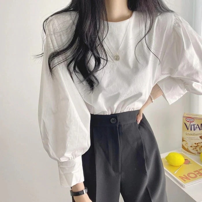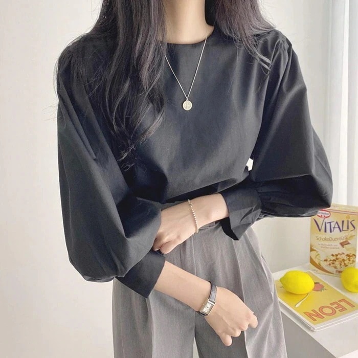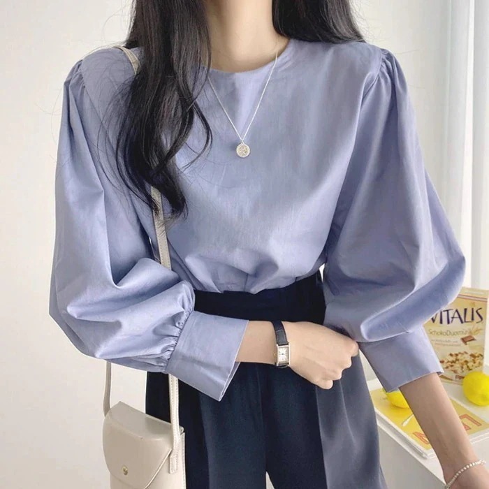 通勤 上品 韓国ファッション ブラウス バルーン袖 レディース シャツ プルオーバー ボリューム袖 長袖 無地 トップス 通勤 OL オシャレ 大人气