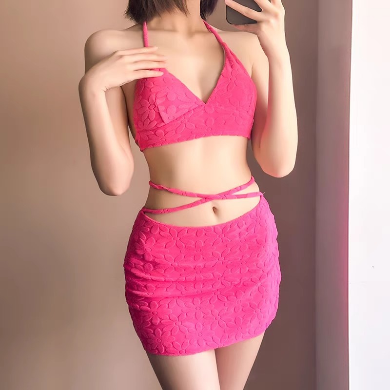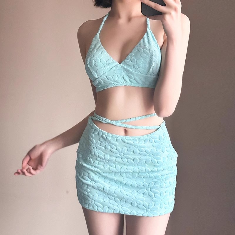 新しいスタイルの小さな新鮮な無地ビキニインスタイル小さな胸の白いタオル素材の海辺の休日の水着女性用3点セット