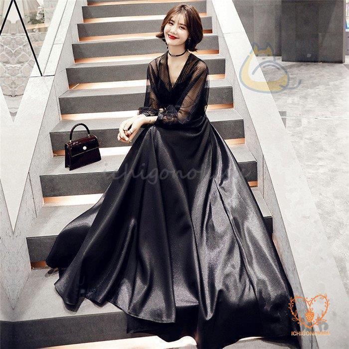 パーティードレス ロング イブニングドレス 20代 30代 40代 ブラック 袖あり ロングドレス おしゃれ 着痩せ 花嫁 発表会 卒業会 結婚式フォーマルドレス