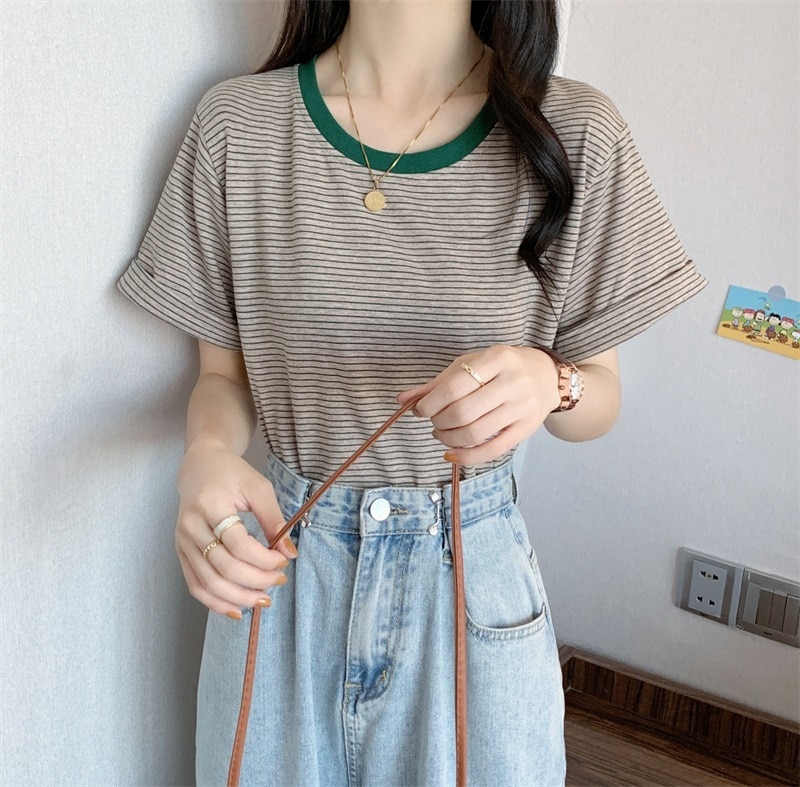 ボーダーTシャツ半袖レディース夏半袖Tシャツ 2024新作ラウンドネックルーズインスモールハートマシン外国人シンプル学生トップスTシャツ