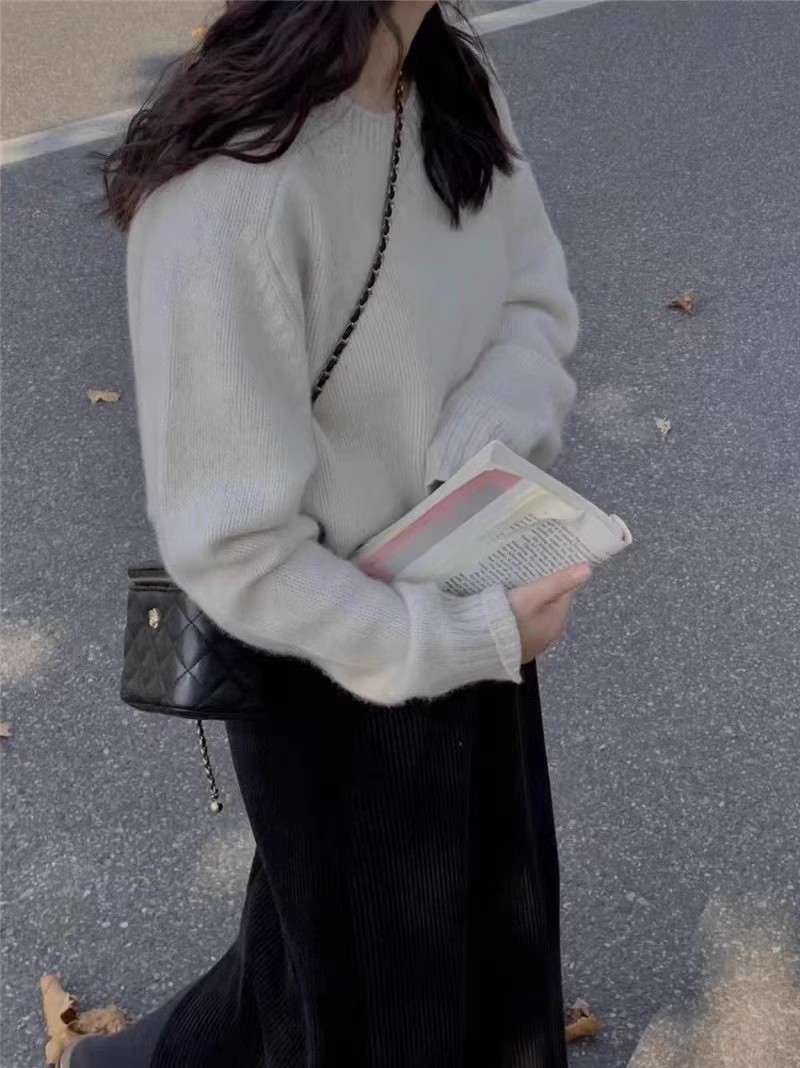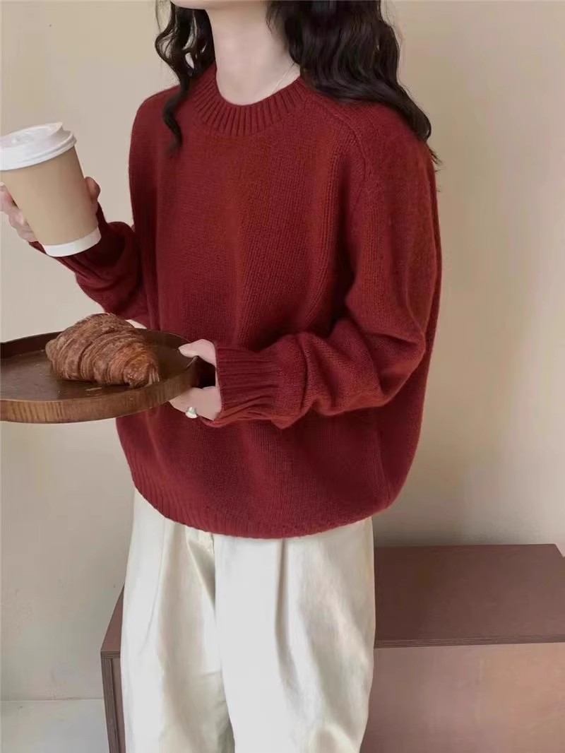 韓国スタイルのルーズラウンドネックスリミングと怠惰なスタイルソリッドカラーソフトワックスウールベルベットデザインパープルセーターニットトップ女性のための