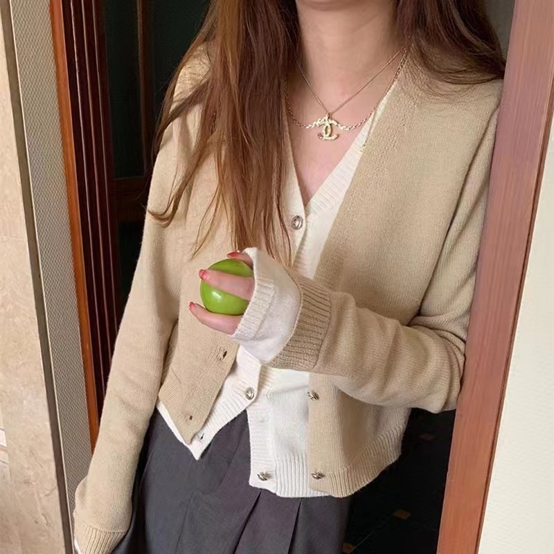 ユニークなデザインの女性用韓国 V ネックフェイクツーピース小さな香りのよいニット カーディガン ジャケット セーター柔らかくワックスのようなコントラストカラーのトップ