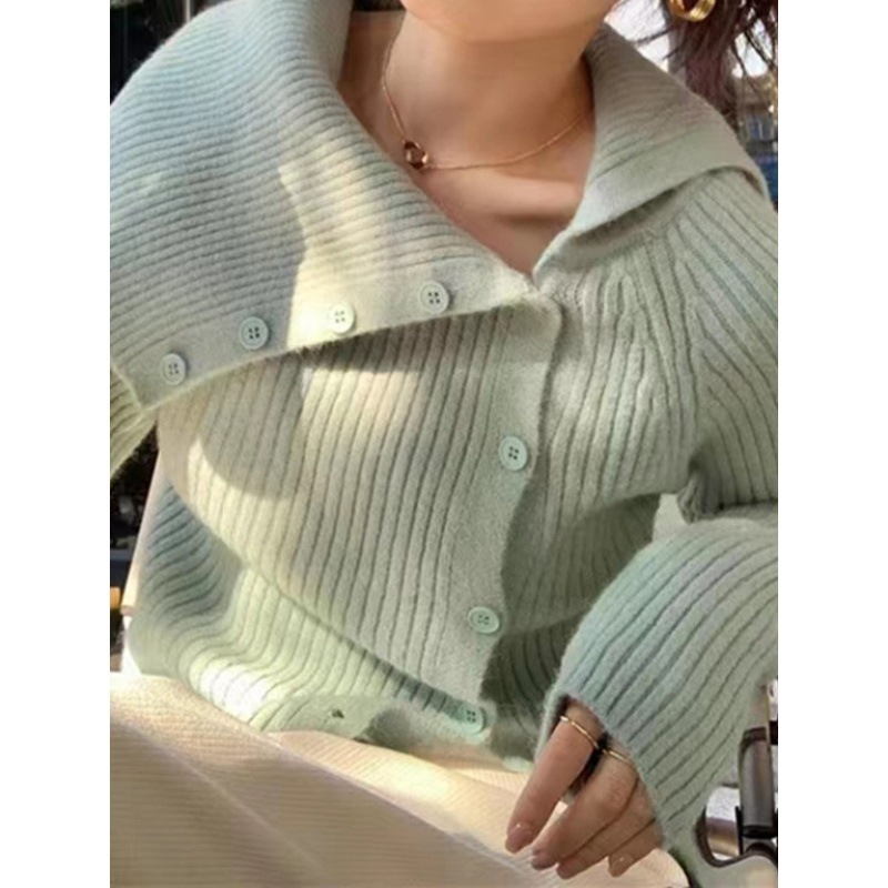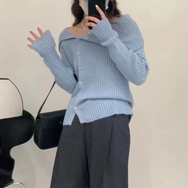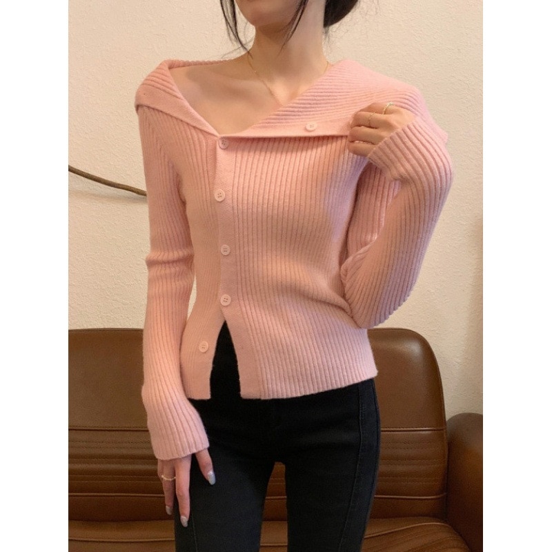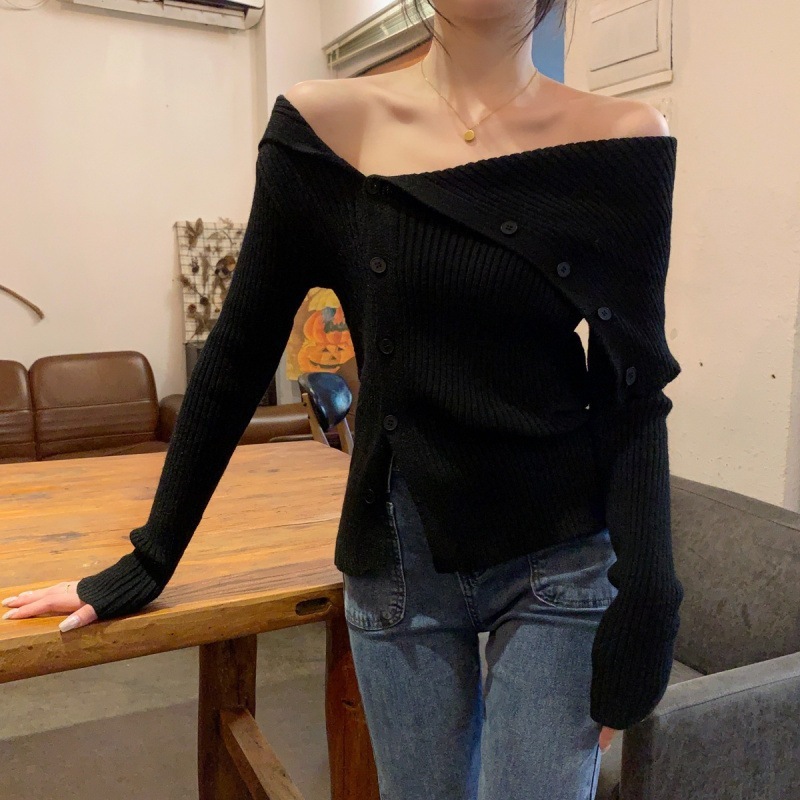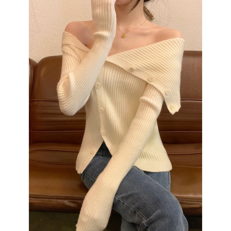 韓国スタイル不規則なラペルワンラインオフショルダー長袖セーター女性のための純粋な欲望スリムアウターウェアファッショナブルなニットカーディガントップ