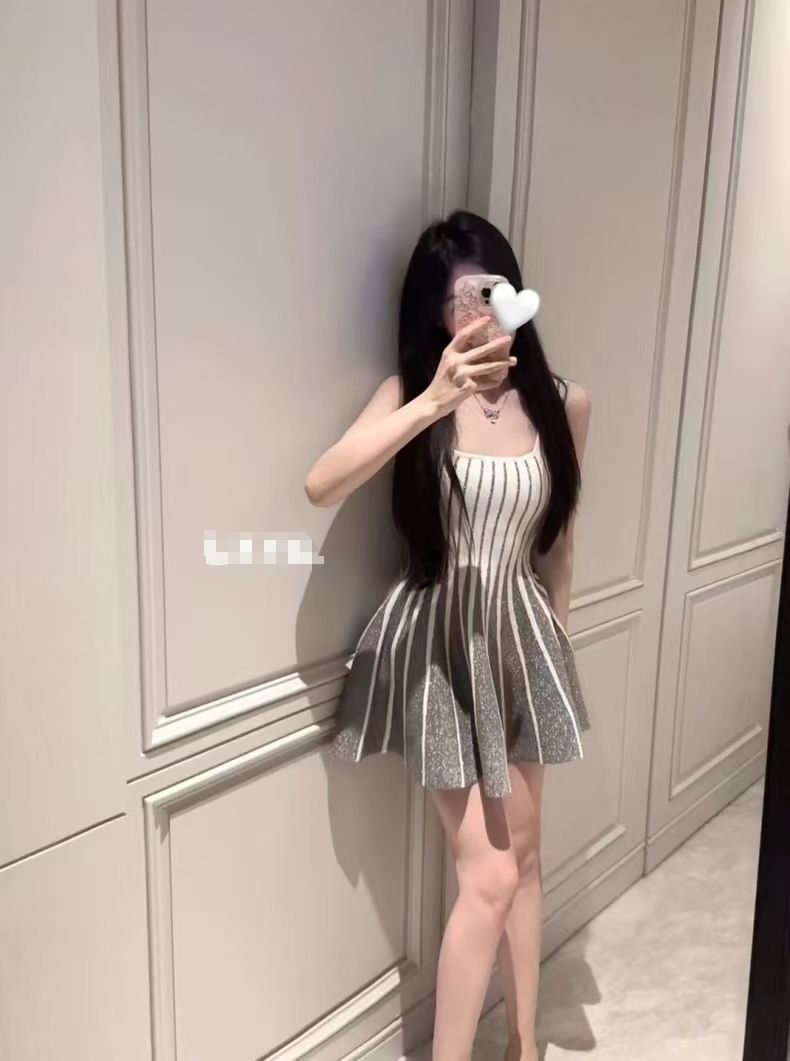 気品溢れるウエスト締め込みデザイン 新作ストライプカミソールワンピース フレンチ風ニット素材 体型にフィットする 夏季新作 ノースリーブ スリム効果のある ベストミニスカート