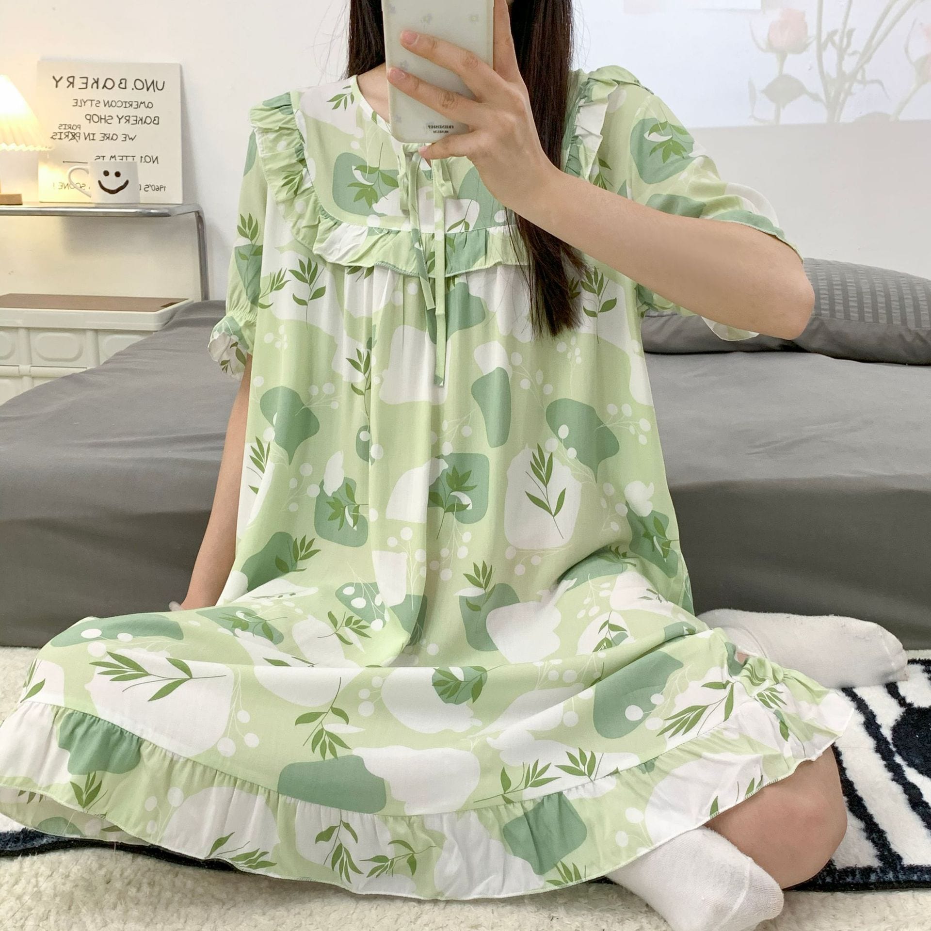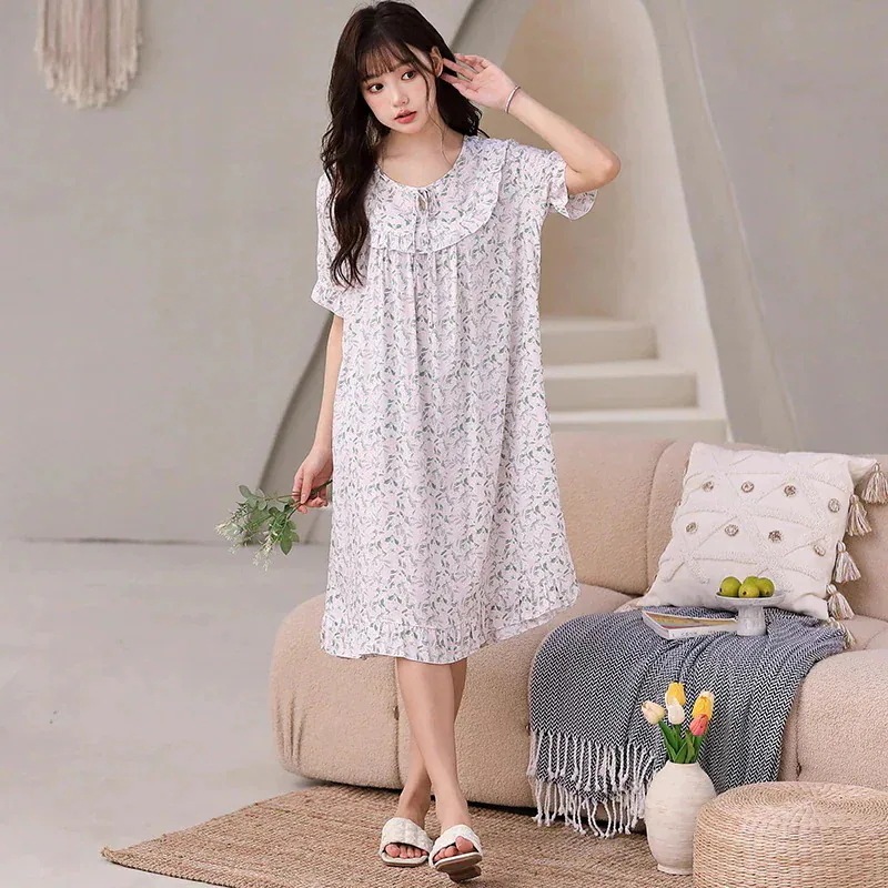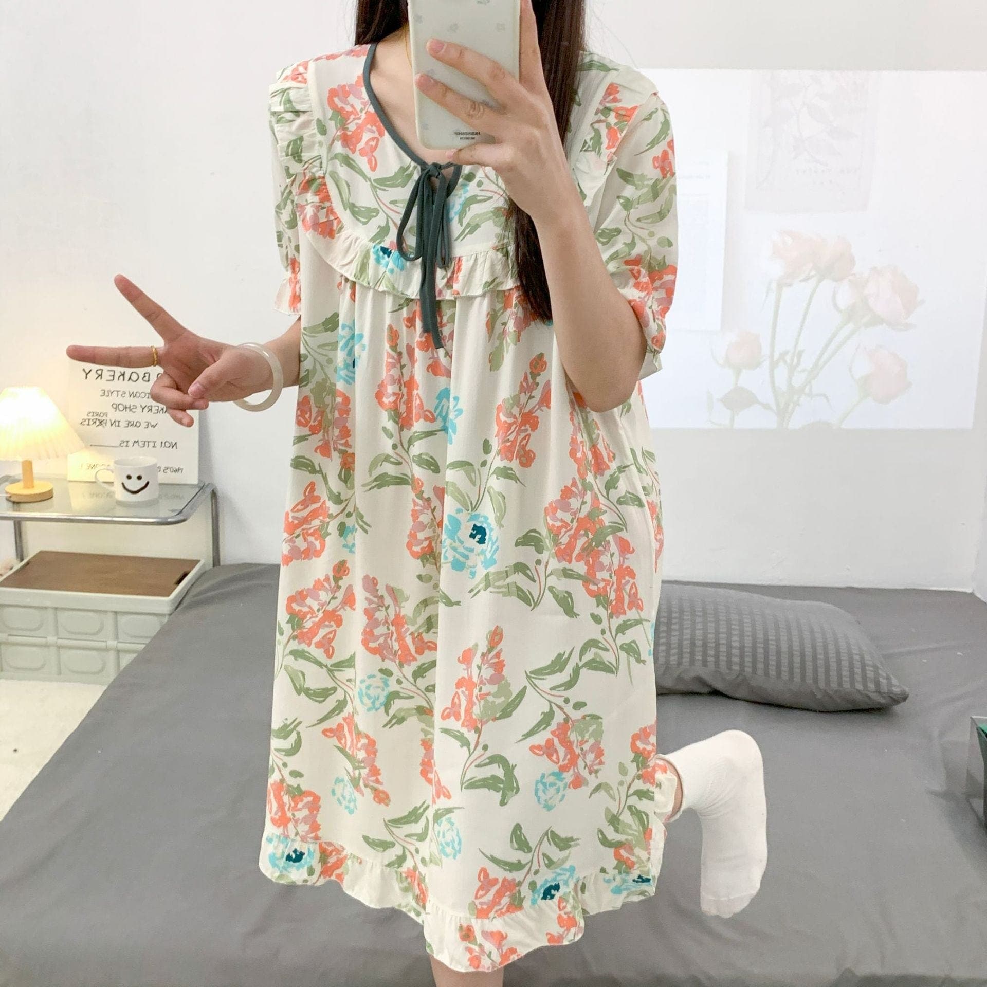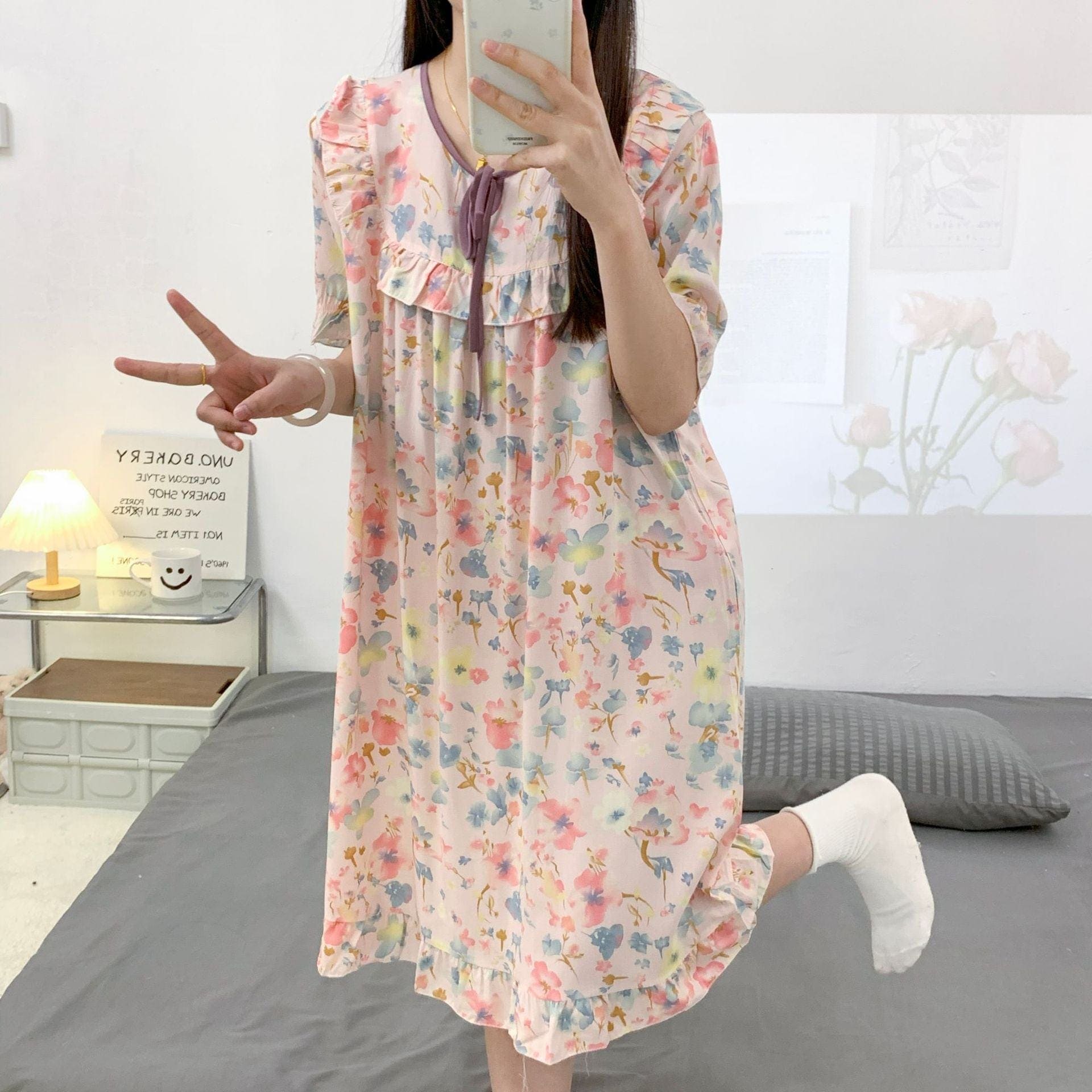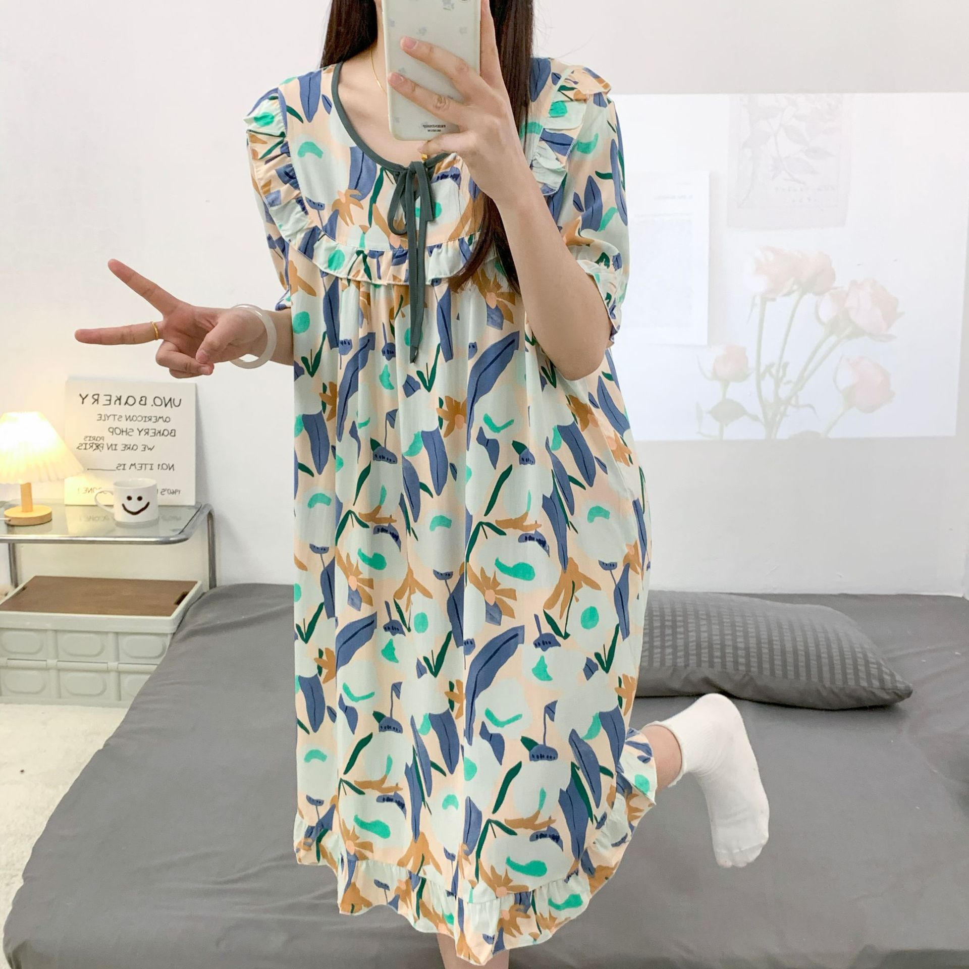 ルームウェア 部屋着 パジャマ 楽ちんルームウェア ネクタイ付きナイトスカート ラウンドネック ニーハイプラスロングスカート 柔らかく快適で通気性のあるフェアリーカジュアルスカート 韓国ファッション