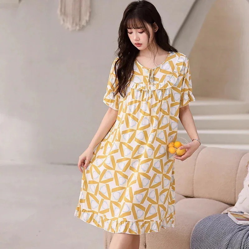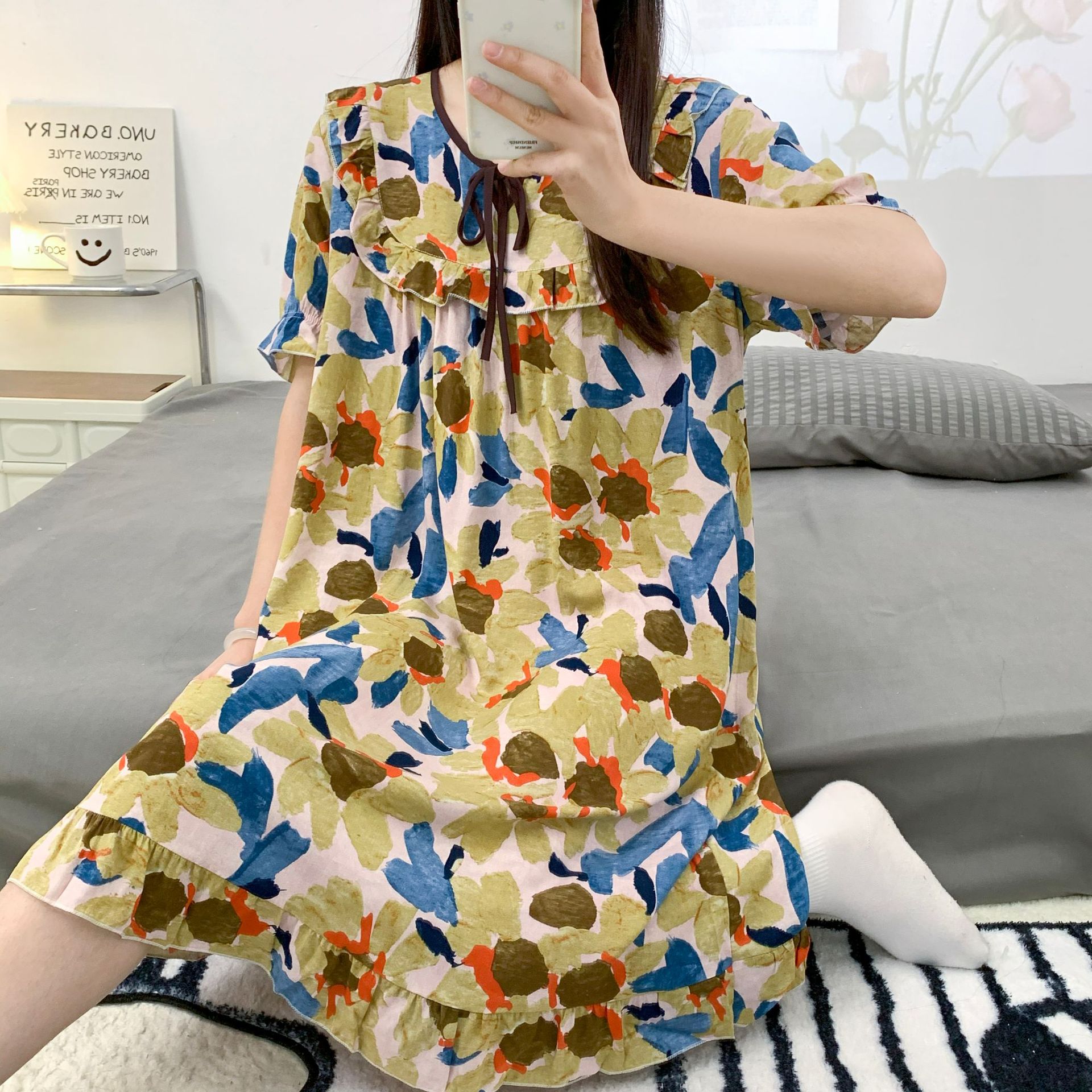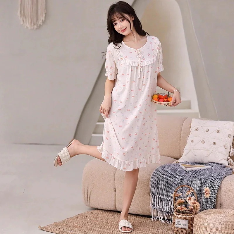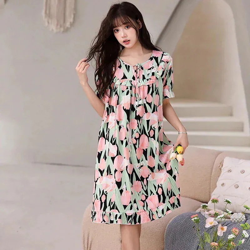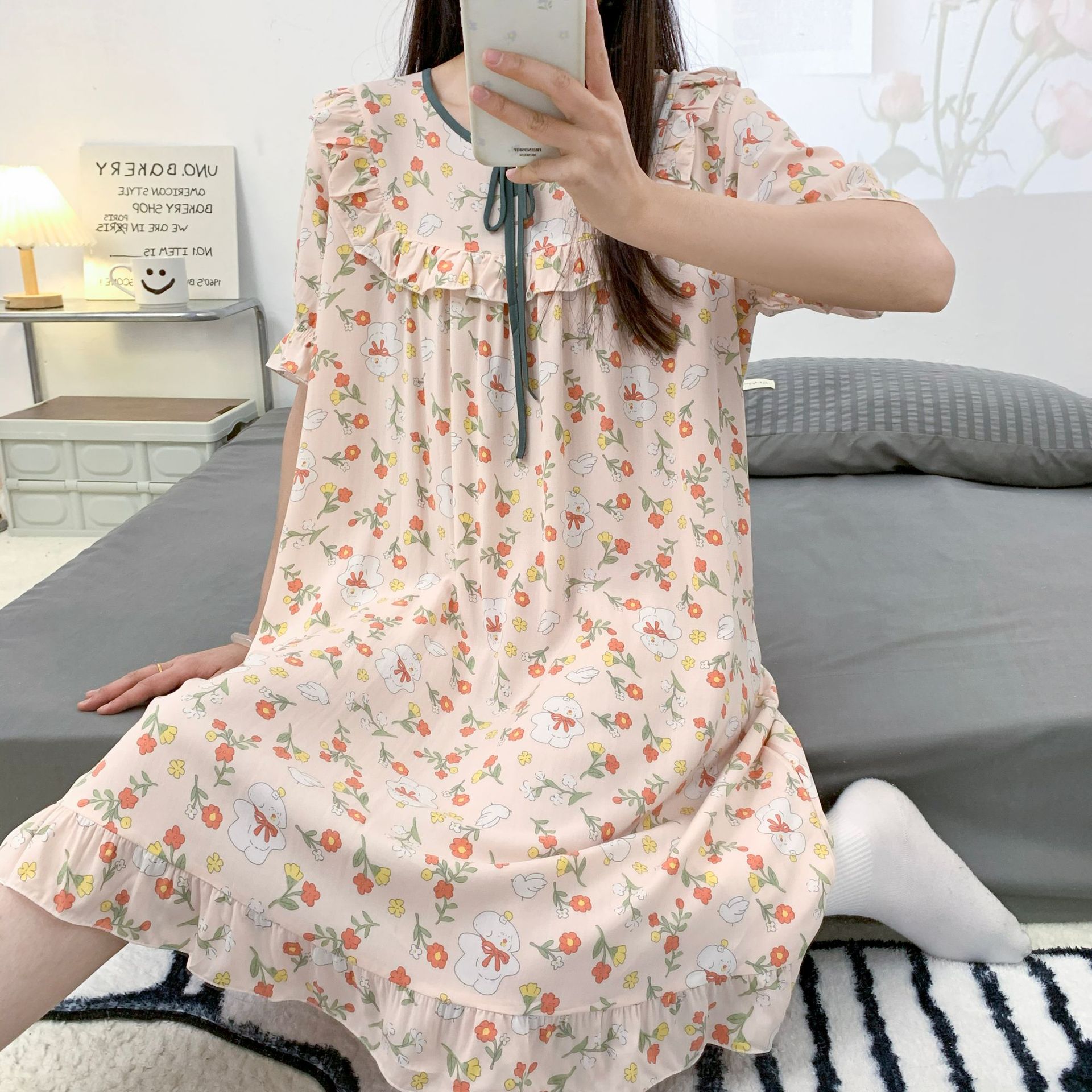 ルームウェア 部屋着 パジャマ 楽ちんルームウェア ネクタイ付きナイトスカート ラウンドネック ニーハイプラスロングスカート 柔らかく快適で通気性のあるフェアリーカジュアルスカート 韓国ファッション