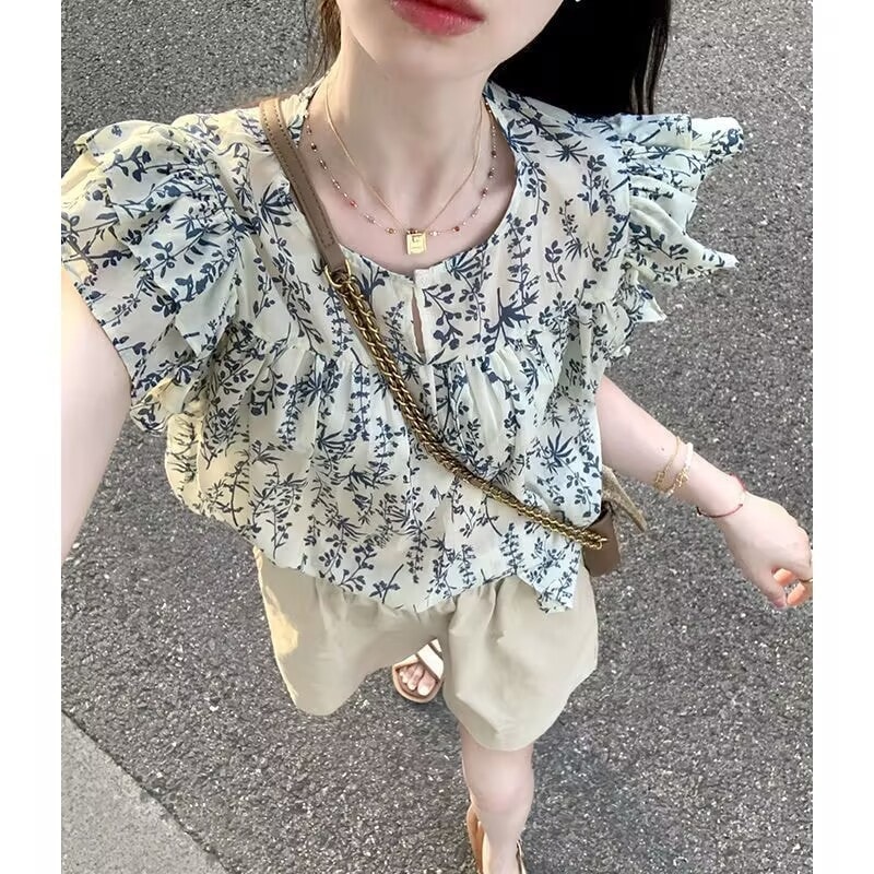 ブラウス 夏 新作 フレンチスリーブ 花柄 半袖シャツ サマー キュート シフォンシャツ ショート丈 トップスレディース デザインブラウス