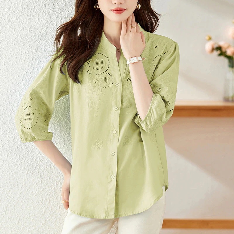 ブラウス 夏 新作 7分袖 新作 通気性 刺繍花柄 vネックトップス キュート 無地 可愛い シャツ トップスレディース デザインブラウス