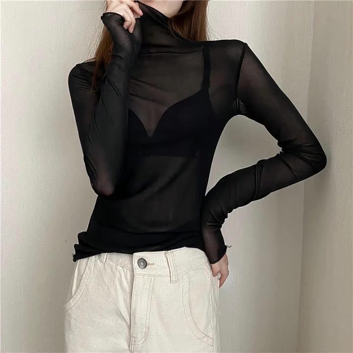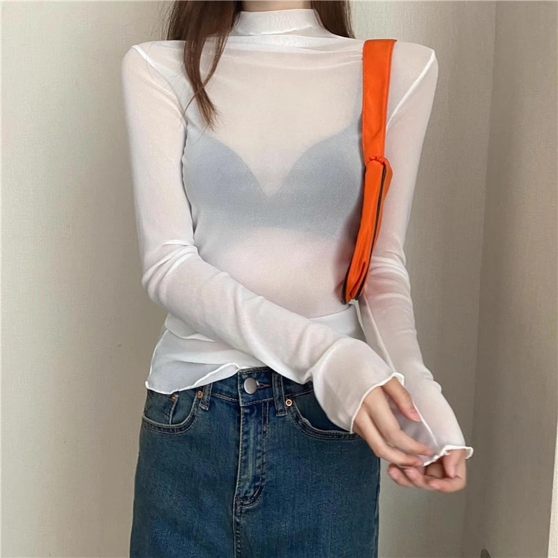 【急速出荷】木耳元ハイネックレースカーディガンインナーロングスリーブ夏洋風重ね着シフォンチュールトップス