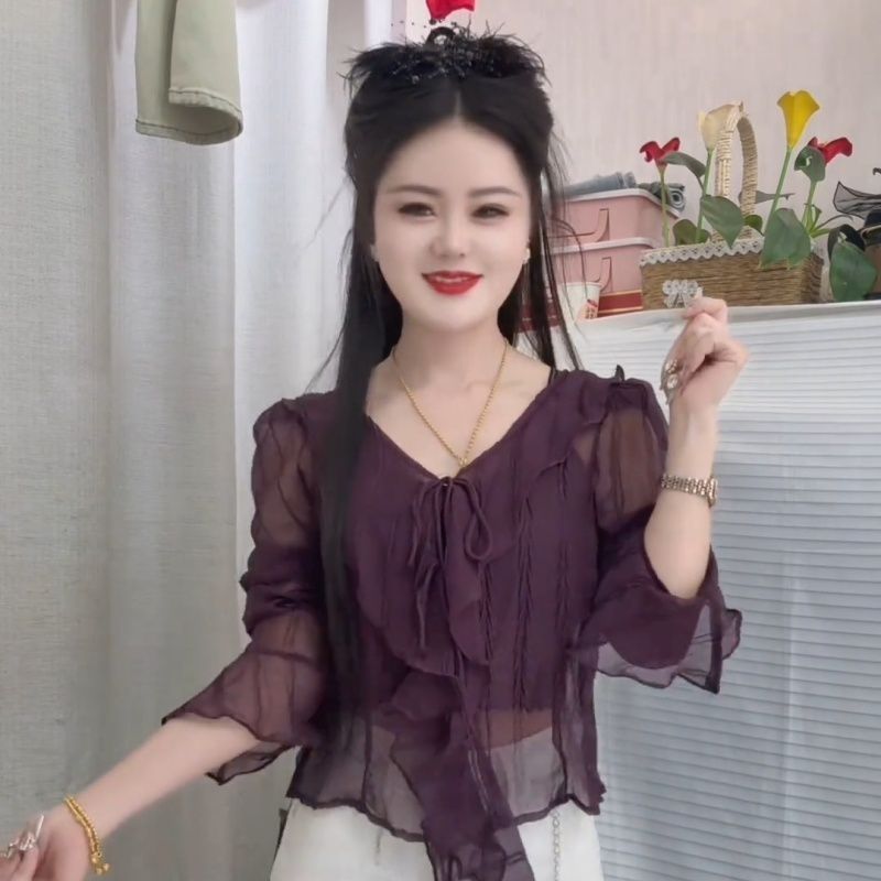 2025 年春夏新作 ファッションで万能 スリム効果あり ルーズ フリルヘム 紐締め フレアスリーブ ショートモデル