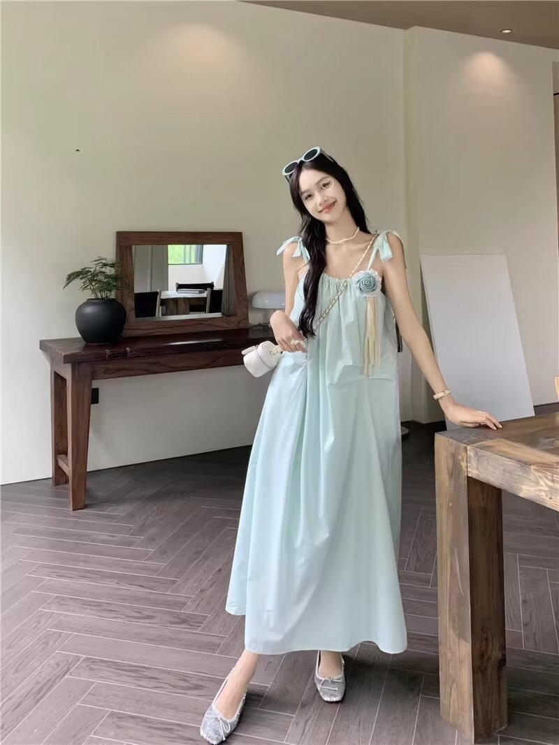 フレンチミントの夏サスペンダードレス女性用ハイエンドスリム気質ノースリーブ海辺ビーチAラインロングスカート