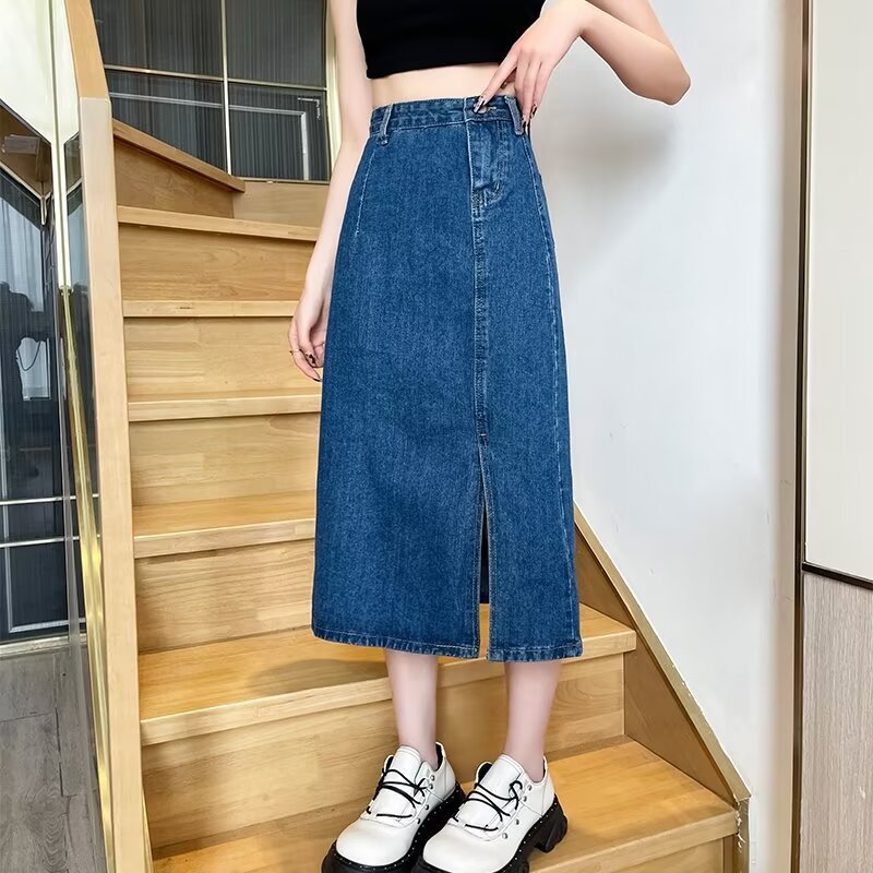 レトロなデニムスカートミドル丈レディースハイウエストAラインスカートスリムオールマッチヒップラップスリットスカート