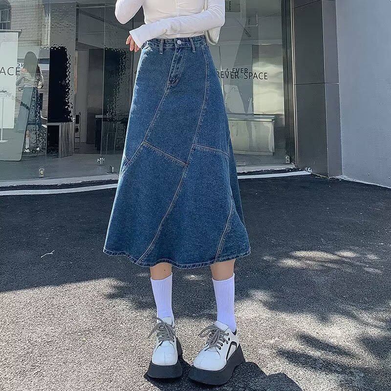 女性用ハイウエストデニムスカート夏の新スタイルスプライシングデザインニッチなミディアムとロングのAラインフィッシュテールスカート