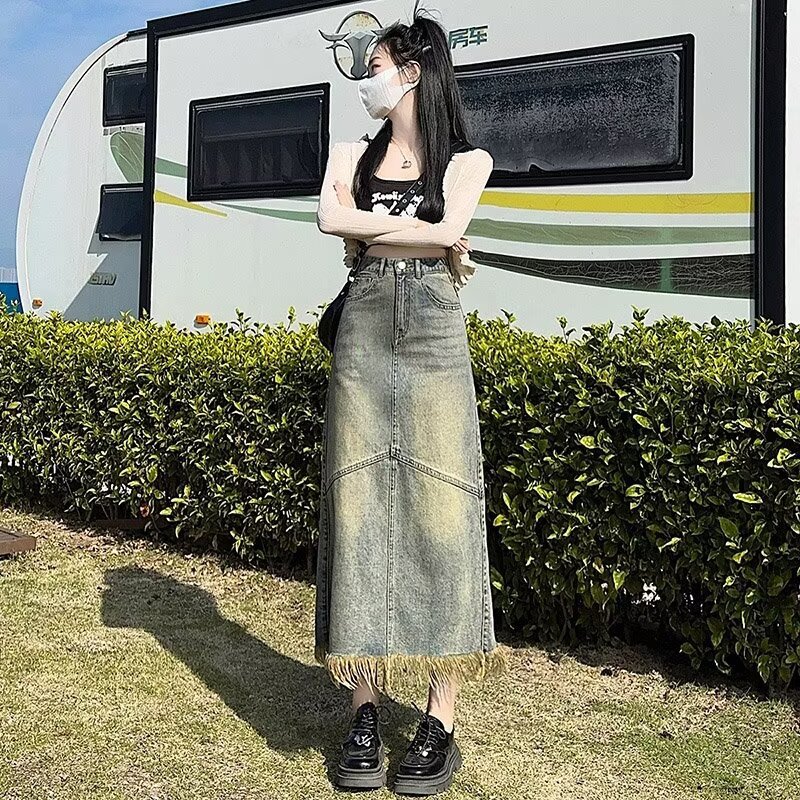 レディースのレトロなデニムスカート春夏の新しいスタイルハイウエストでスリムなAラインのミドル丈スカート