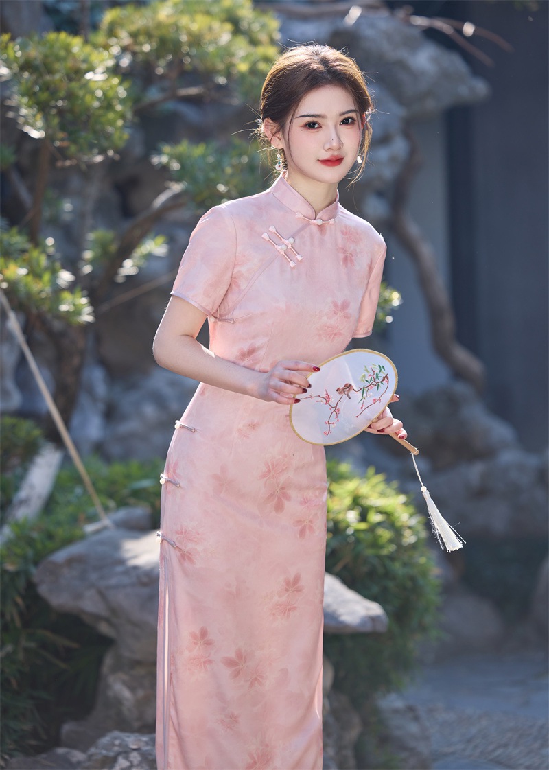2025年春夏新作イミテーションアセテートジャカードロングチャイナドレスピンク新中国風民族風アートチャイナドレス半袖チャイナドレス