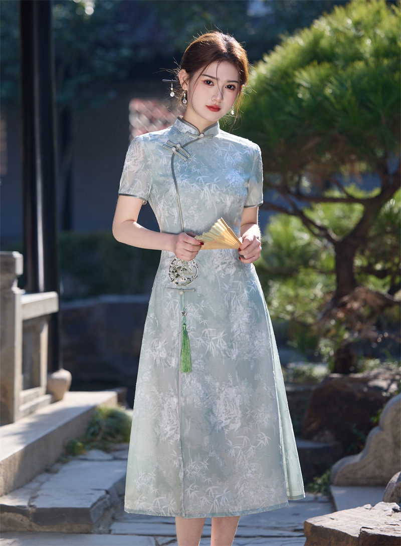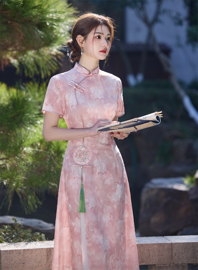 2025年春夏新作 ジャカード刺繍 ミディアム丈 ダブルレイヤー アオザイ チャイナドレス ピンク ヤングスタイル 半袖 レディース チャイナドレス